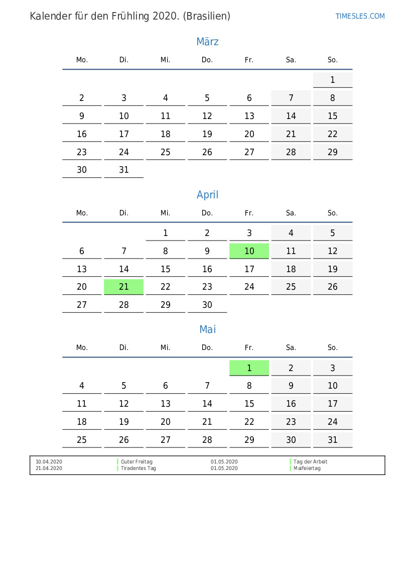 Laden Sie den PDF-Kalender mit Feiertagen und Wochenenden für den Frühling 2020 für Brasilien herunter und drucken Sie ihn aus