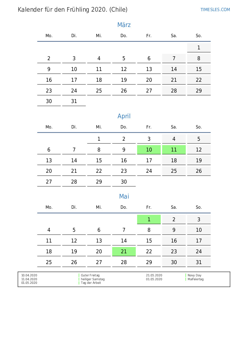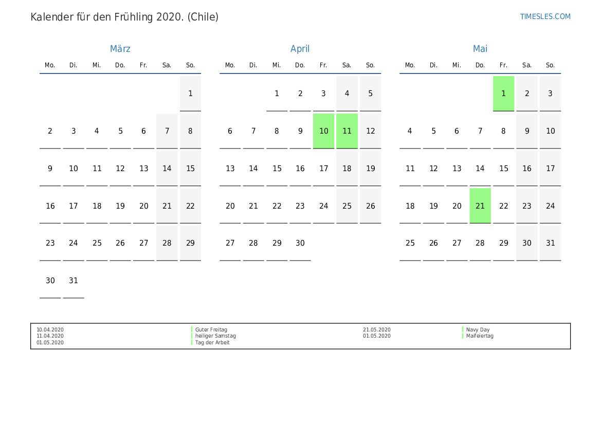 Laden Sie den PDF-Kalender mit Feiertagen und Wochenenden für den Frühling 2020 für Chile herunter und drucken Sie ihn aus