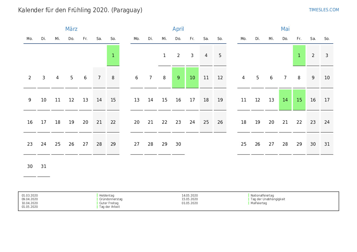 Kalender der Feiertage und Wochenenden für den Frühling 2020 für Paraguay