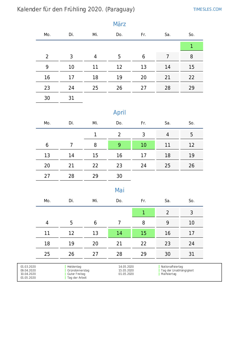 Laden Sie den PDF-Kalender mit Feiertagen und Wochenenden für den Frühling 2020 für Paraguay herunter und drucken Sie ihn aus