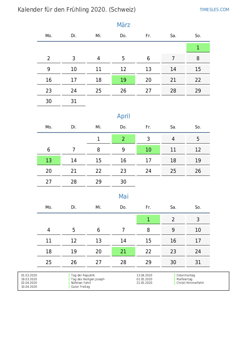 Laden Sie den PDF-Kalender mit Feiertagen und Wochenenden für den Frühling 2020 für die Schweiz herunter und drucken Sie ihn aus