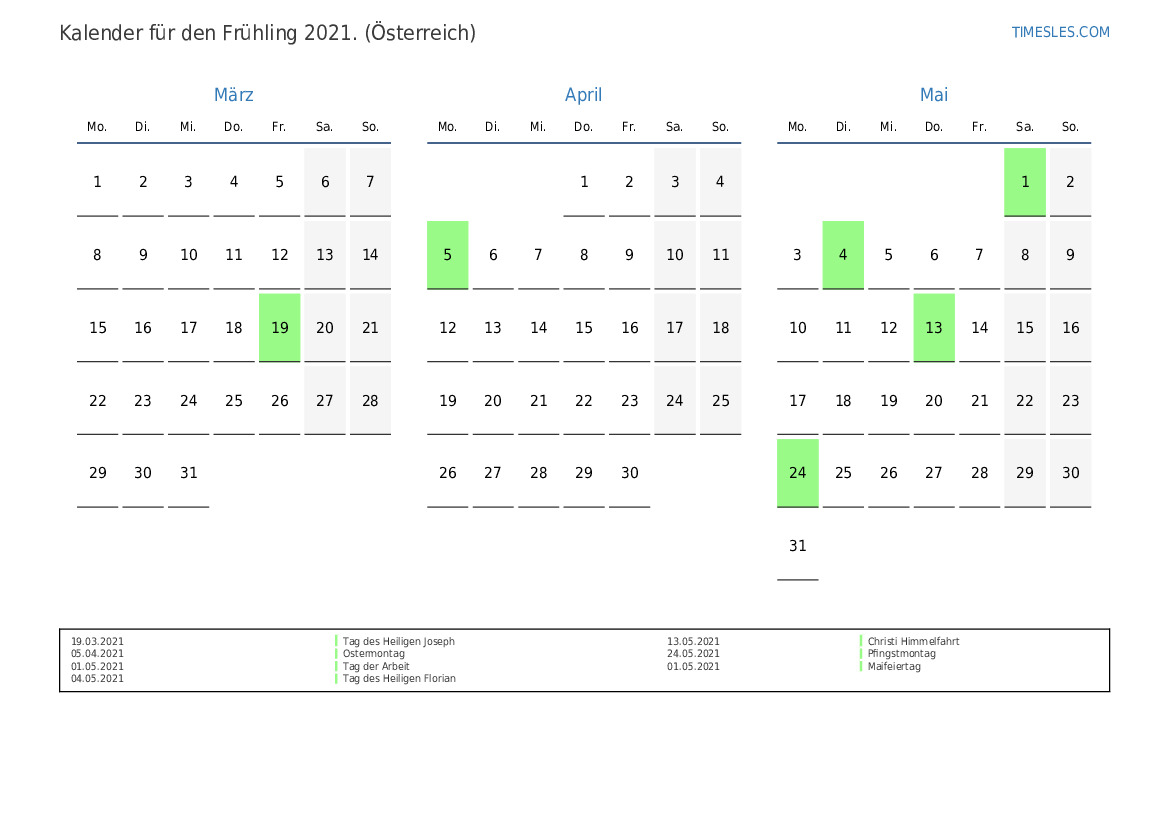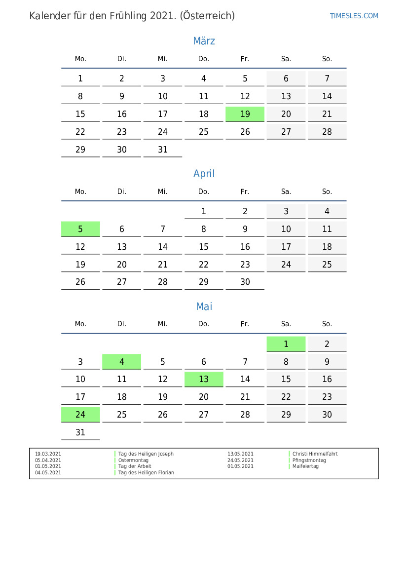 Laden Sie den PDF-Kalender mit Feiertagen und Wochenenden für den Frühling 2021 für Österreich herunter und drucken Sie ihn aus