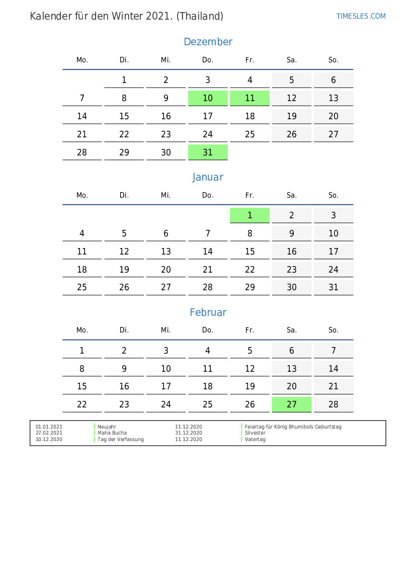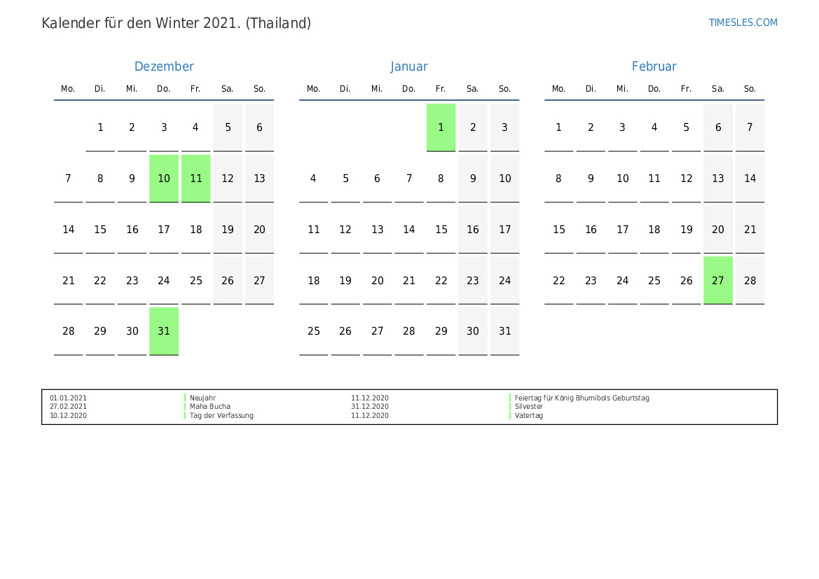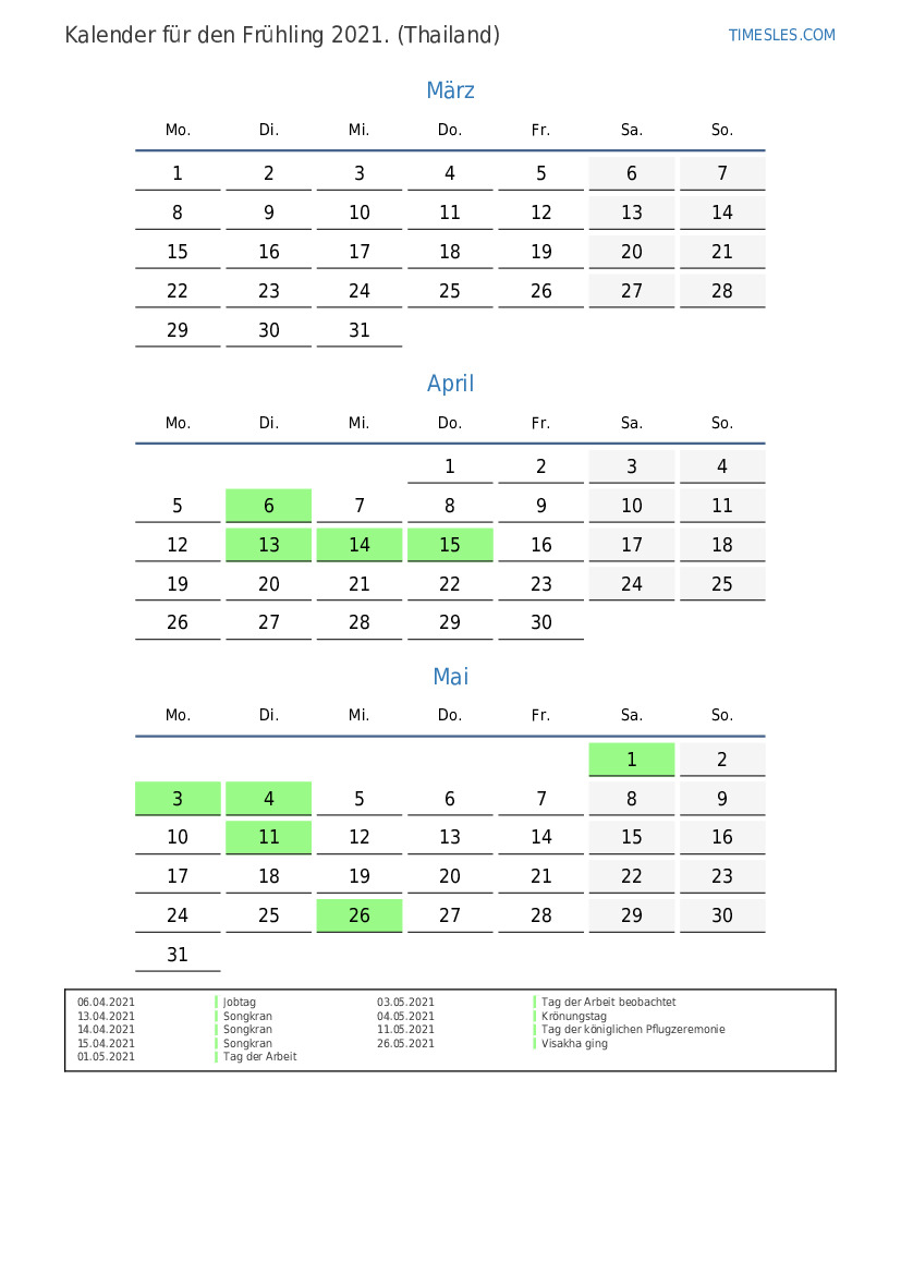 Laden Sie den PDF-Kalender mit Feiertagen und Wochenenden für den Frühling 2021 für Thailand herunter und drucken Sie ihn aus