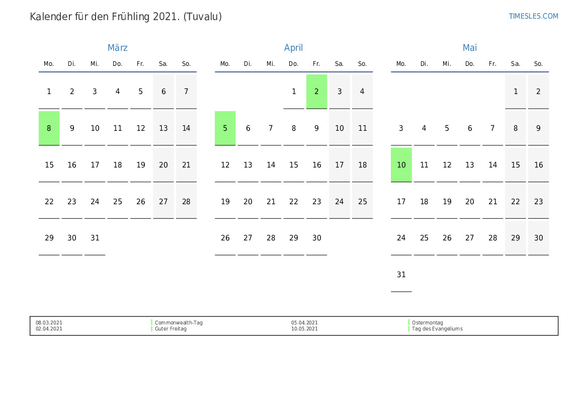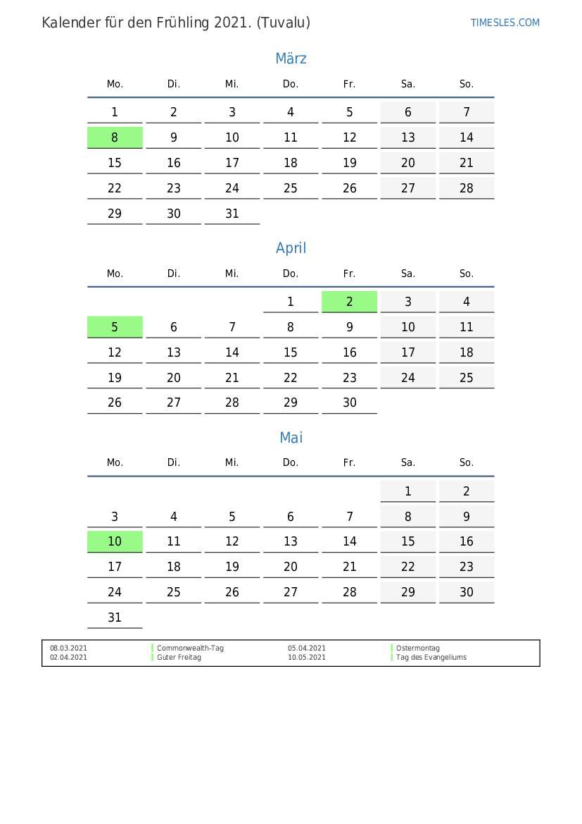Laden Sie den PDF-Kalender mit Feiertagen und Wochenenden für den Frühling 2021 für Tuvalu herunter und drucken Sie ihn aus