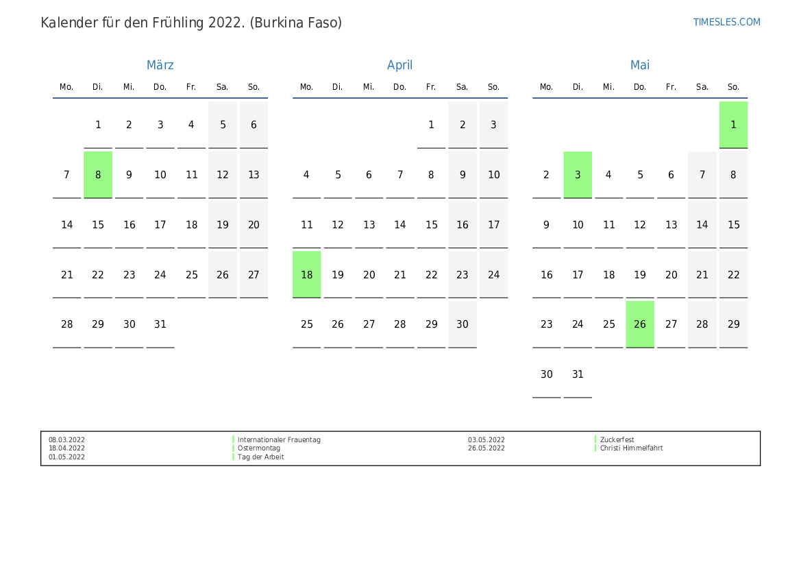 Kalender der Feiertage und Wochenenden für den Frühling 2022 für Burkina Faso
