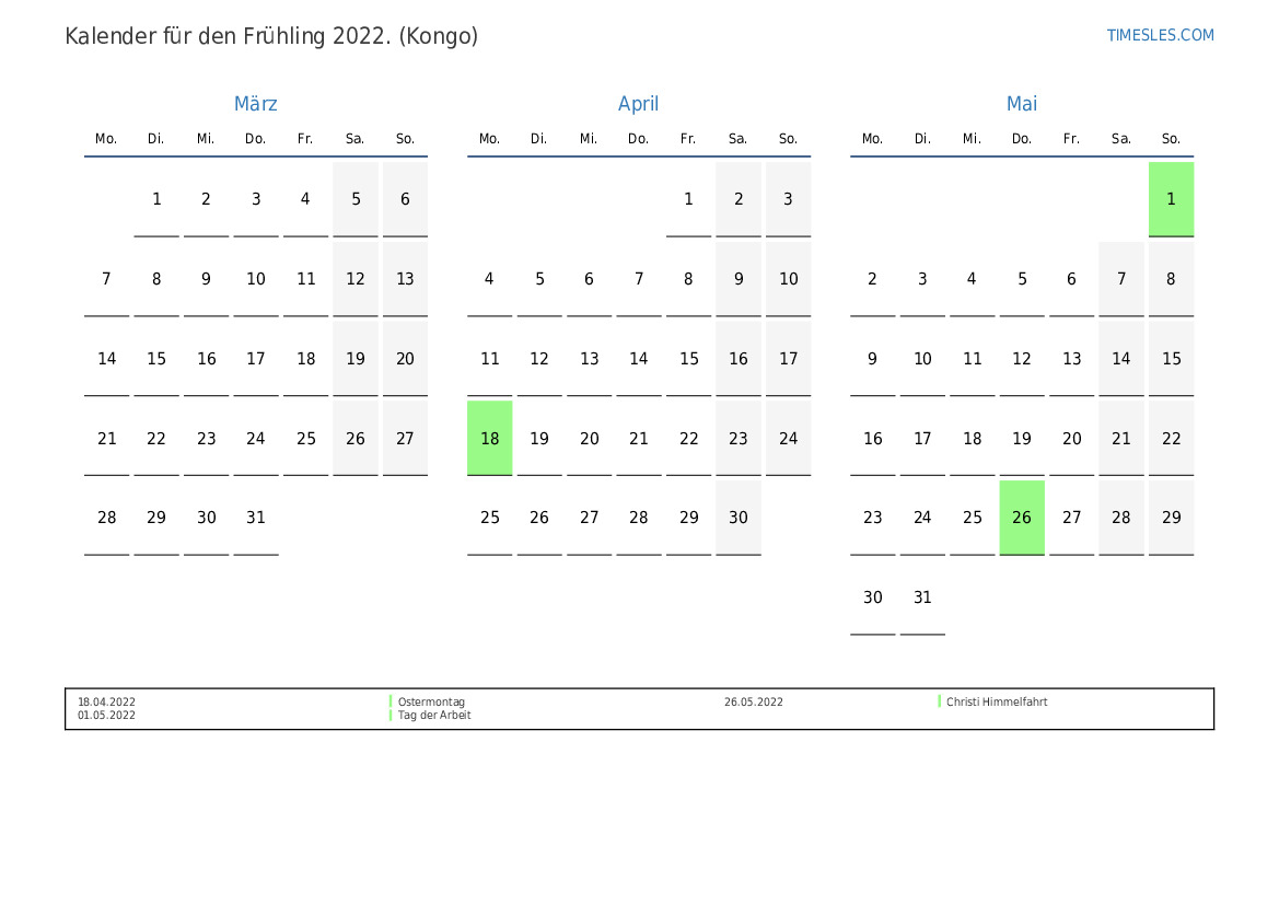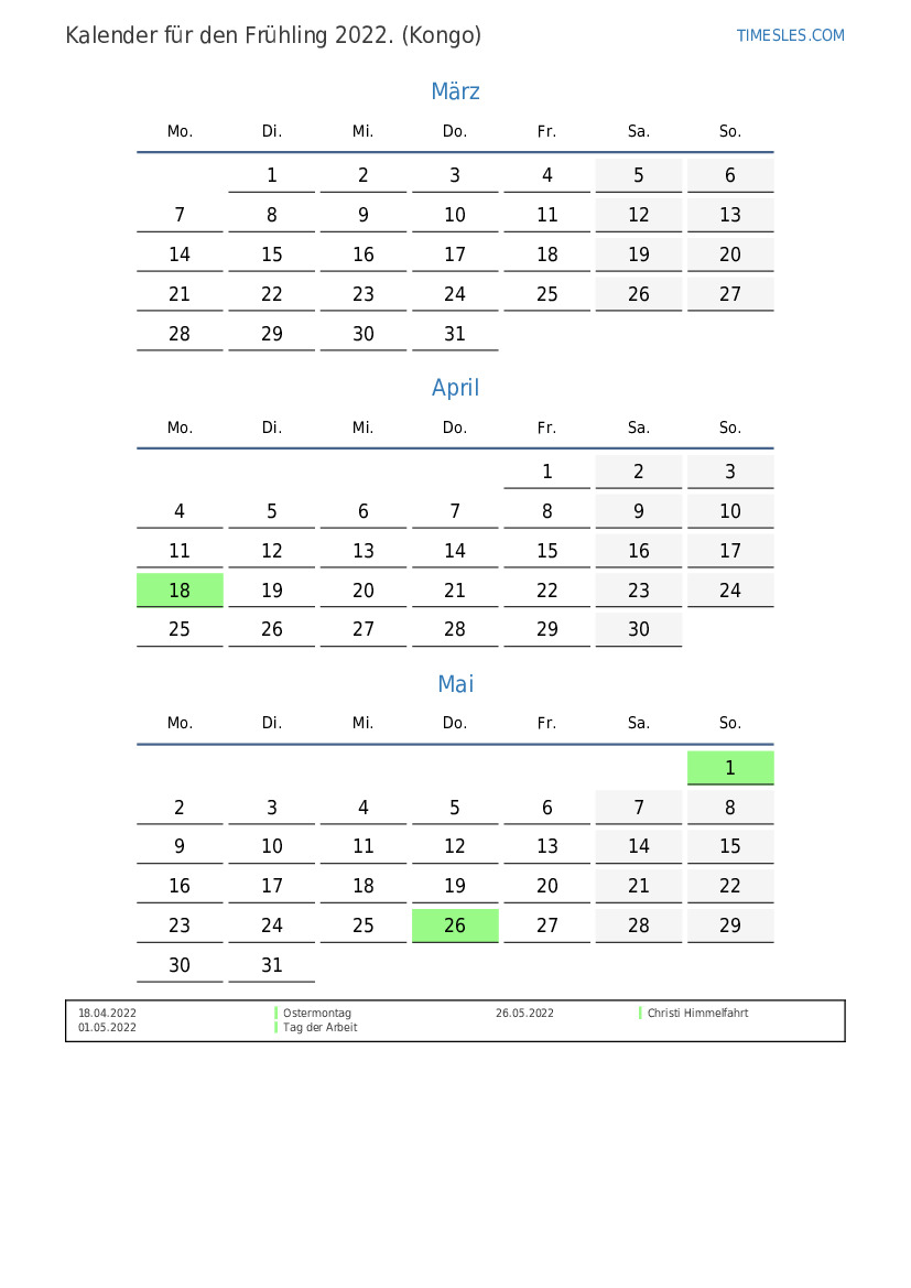 Laden Sie den PDF-Kalender mit Feiertagen und Wochenenden für den Frühling 2022 für den Kongo herunter und drucken Sie ihn aus