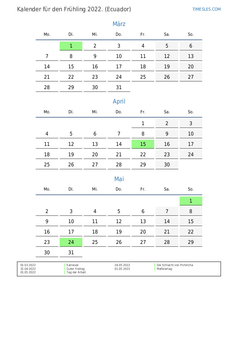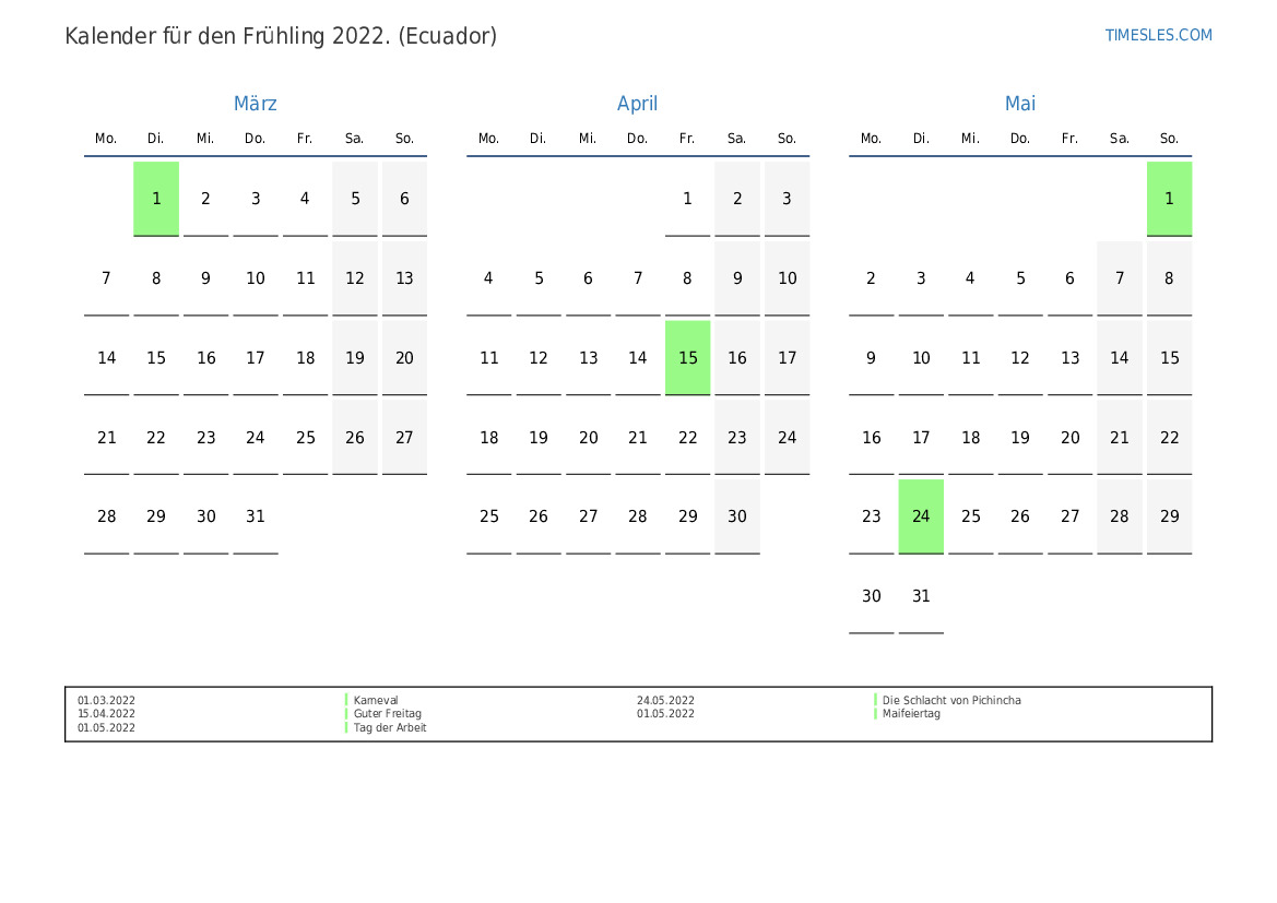 Laden Sie den PDF-Kalender mit Feiertagen und Wochenenden für den Frühling 2022 für Ecuador herunter und drucken Sie ihn aus