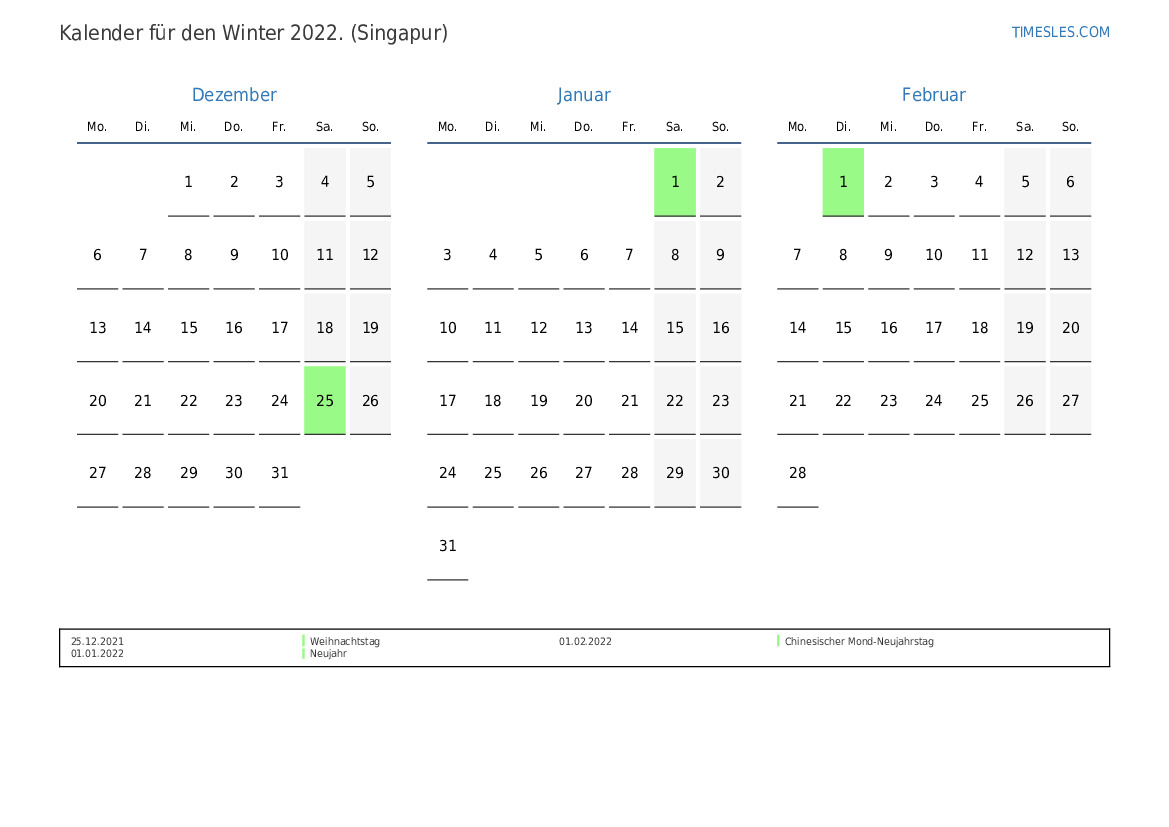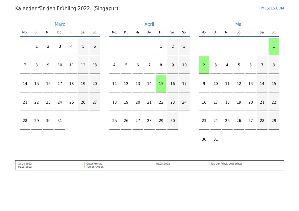Laden Sie den PDF-Kalender mit Feiertagen und Wochenenden für den Frühling 2022 für Singapur herunter und drucken Sie ihn aus