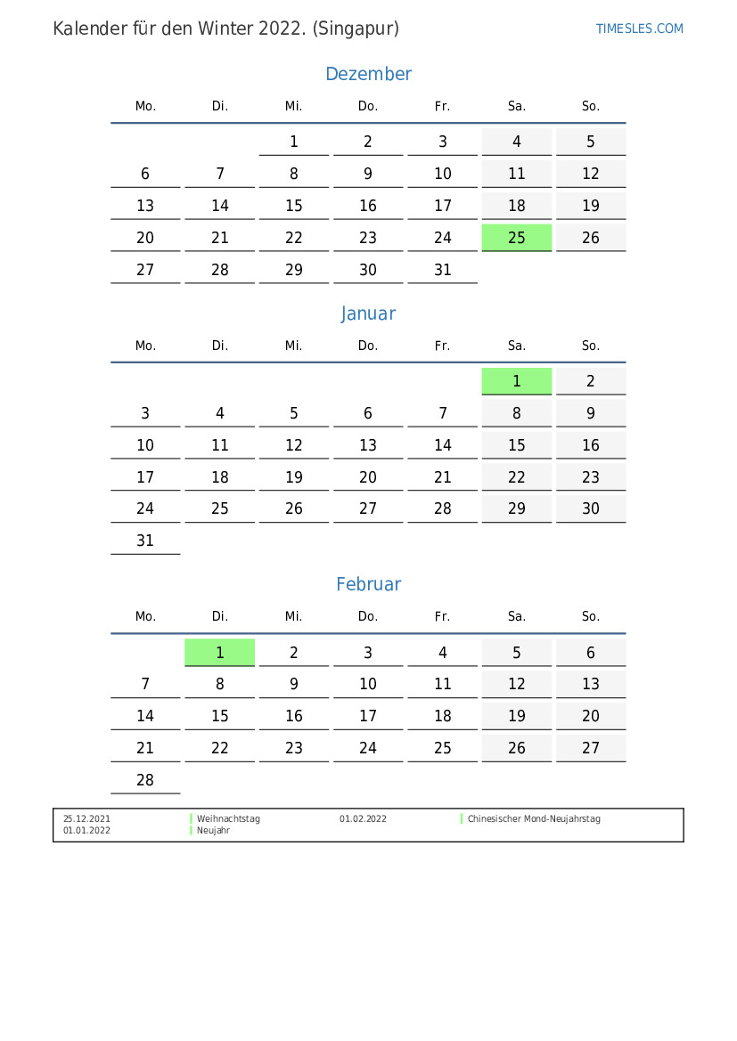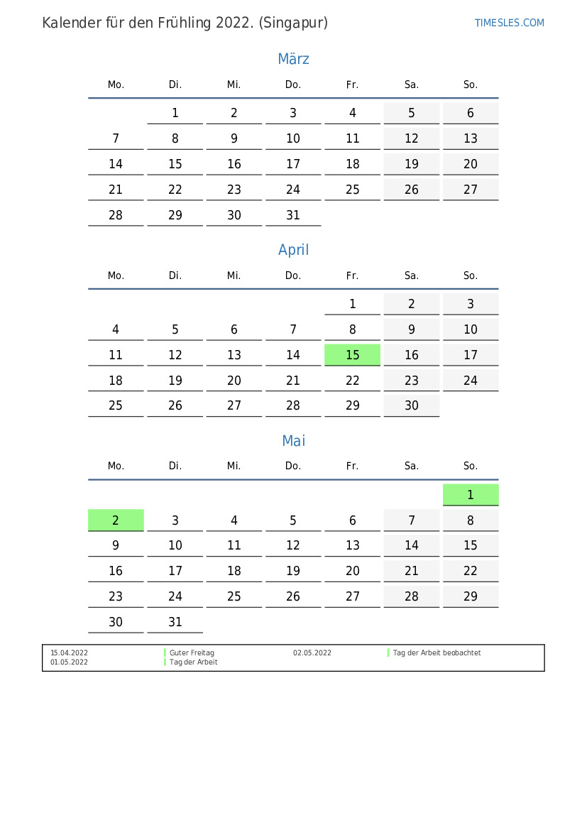 Kalender der Feiertage und Wochenenden für den Frühling 2022 für Singapur