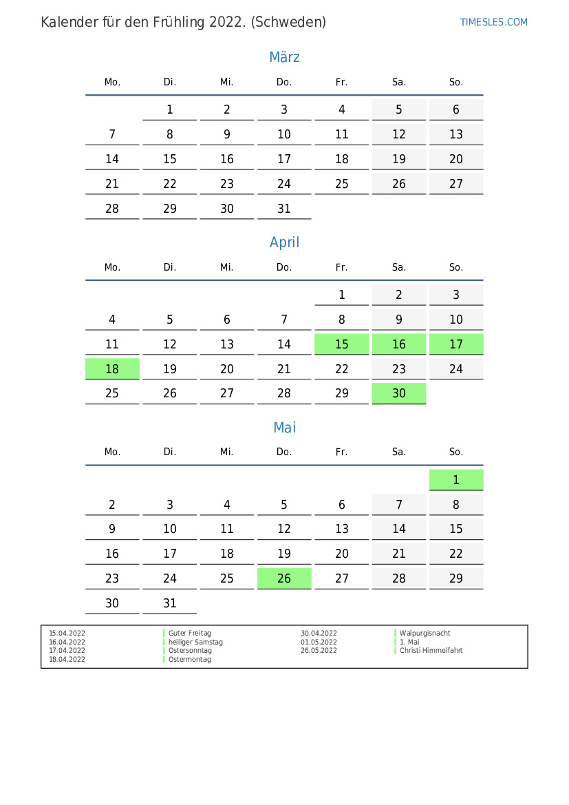 Laden Sie den PDF-Kalender mit Feiertagen und Wochenenden für den Frühling 2022 für Schweden herunter und drucken Sie ihn aus