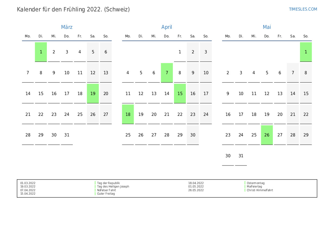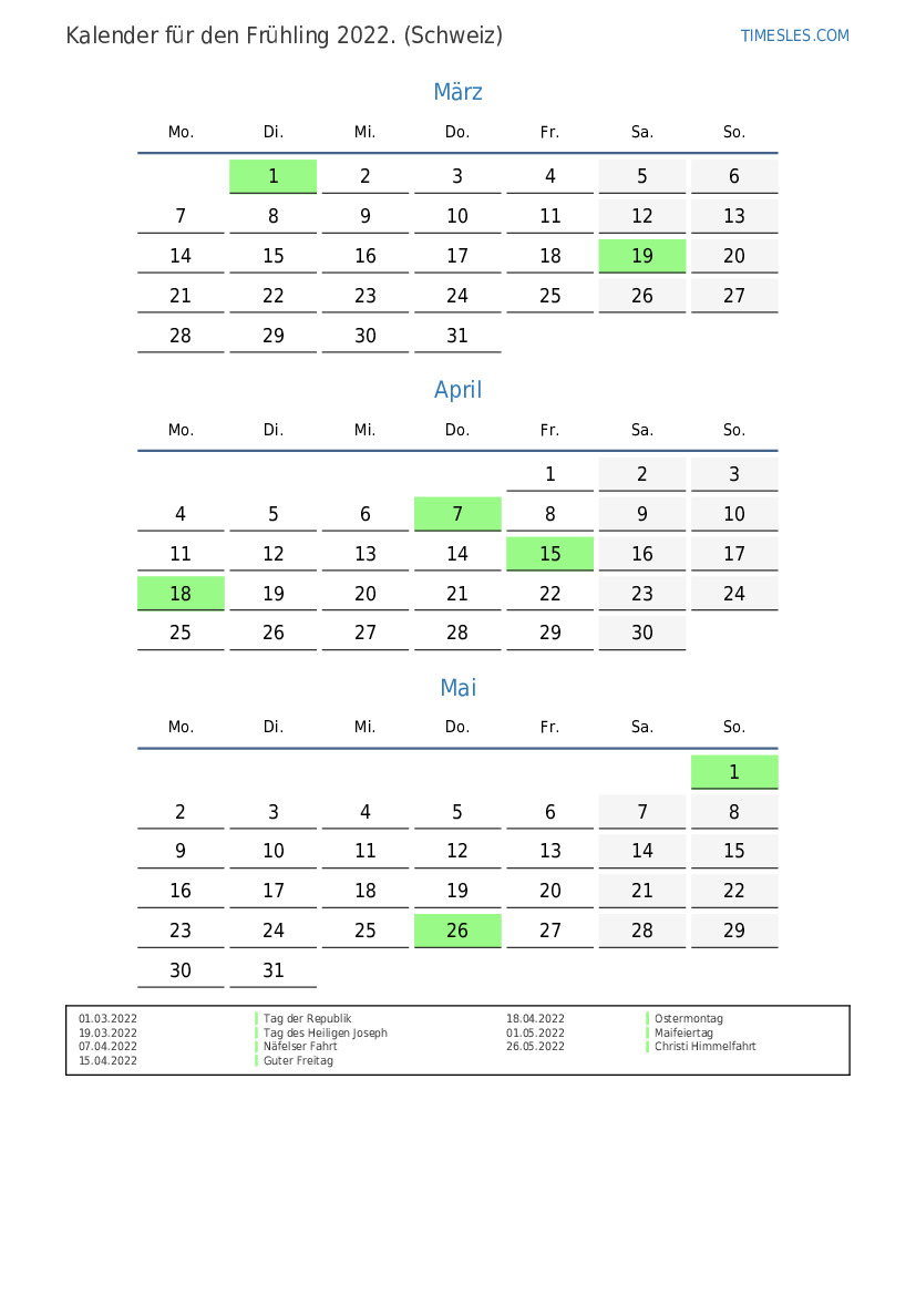 Laden Sie den PDF-Kalender mit Feiertagen und Wochenenden für den Frühling 2022 für die Schweiz herunter und drucken Sie ihn aus