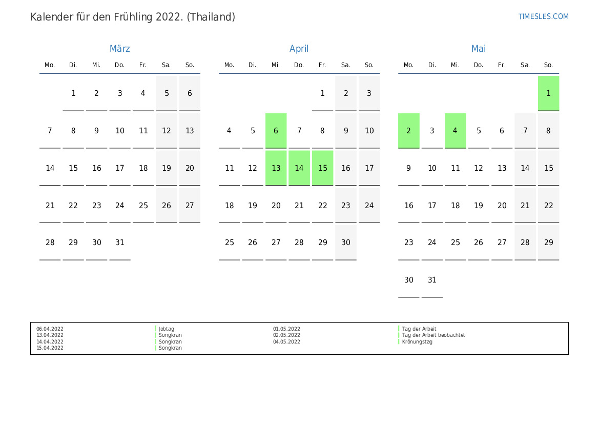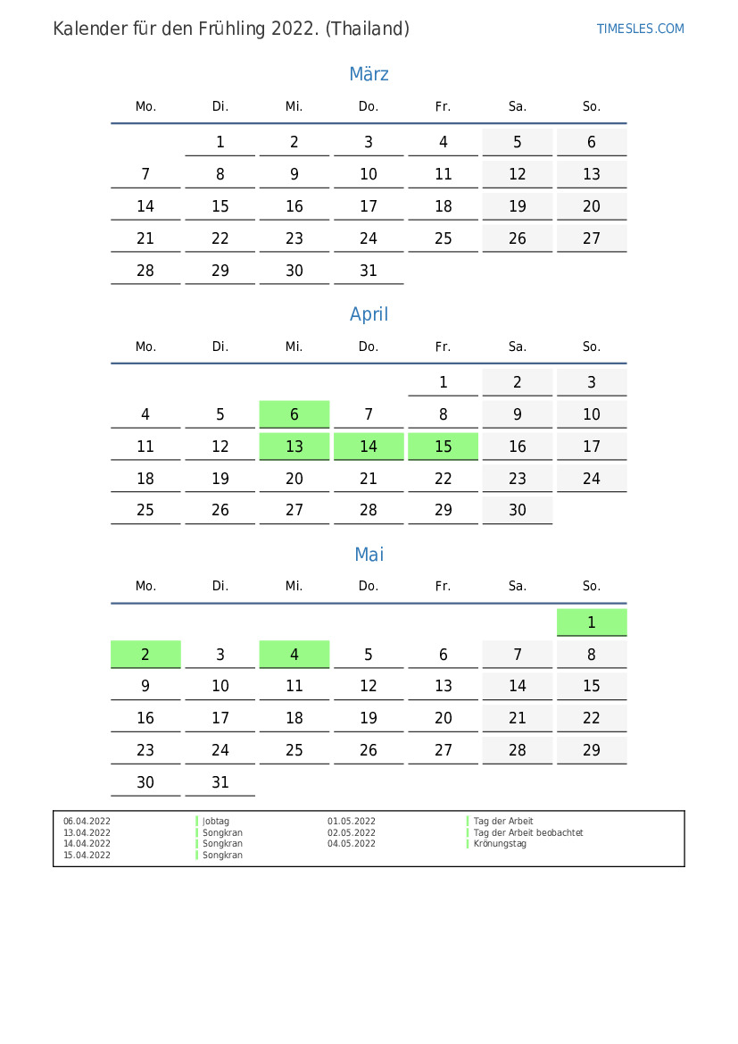 Laden Sie den PDF-Kalender mit Feiertagen und Wochenenden für den Frühling 2022 für Thailand herunter und drucken Sie ihn aus