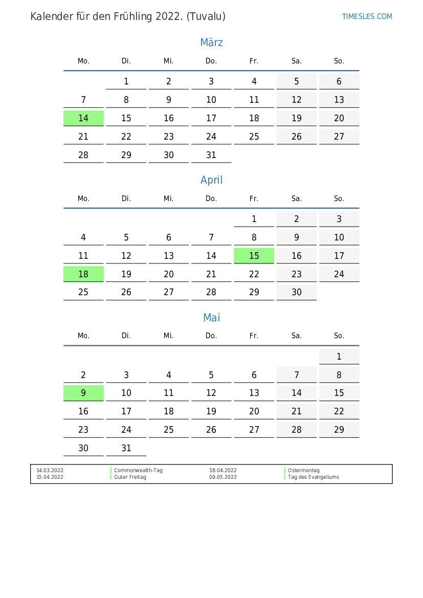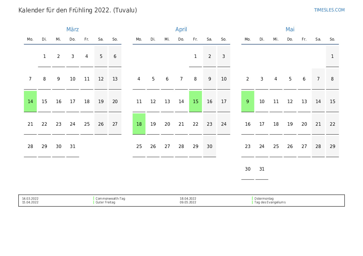 Laden Sie den PDF-Kalender mit Feiertagen und Wochenenden für den Frühling 2022 für Tuvalu herunter und drucken Sie ihn aus