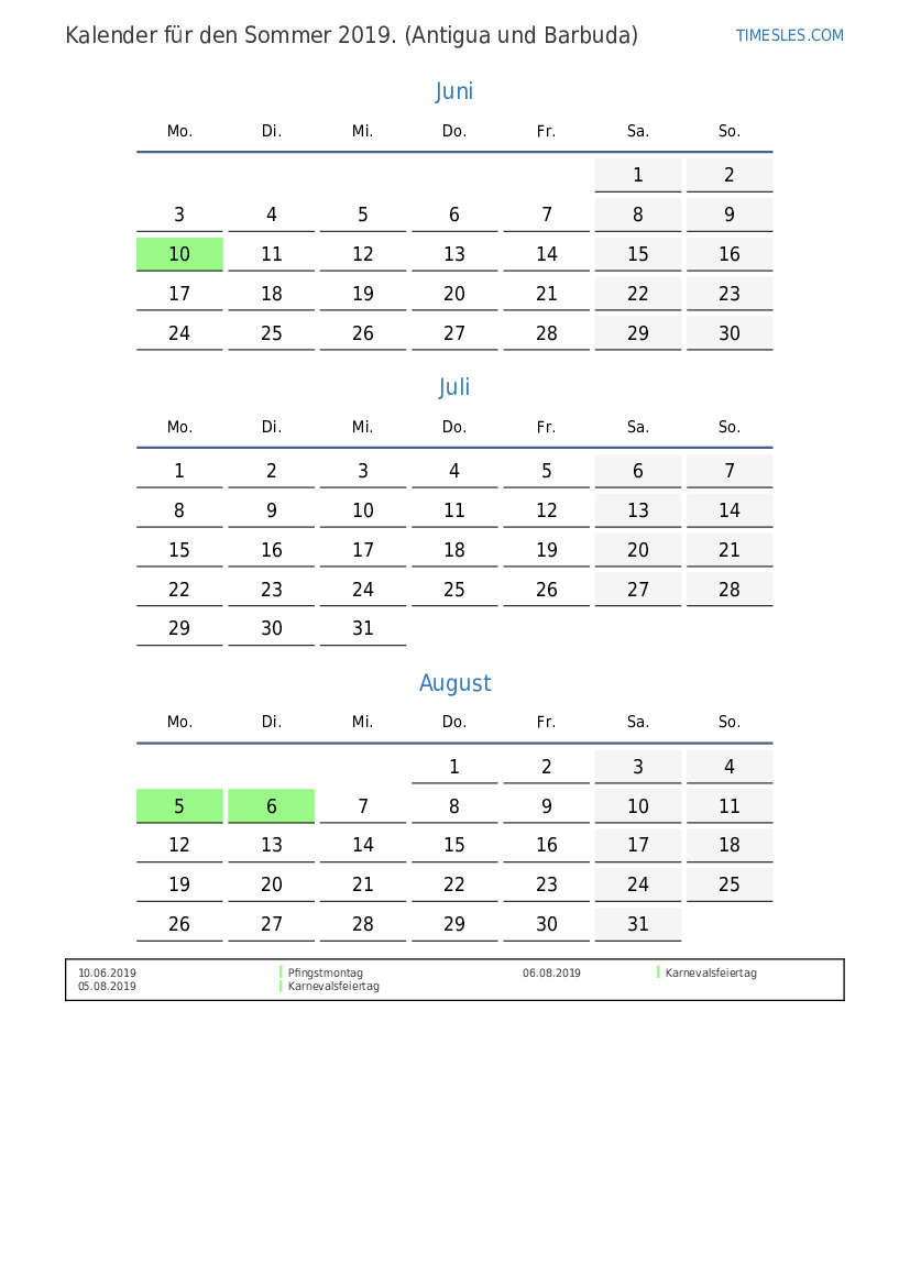 Kalender für den Sommer 2019 für Antigua und Barbuda