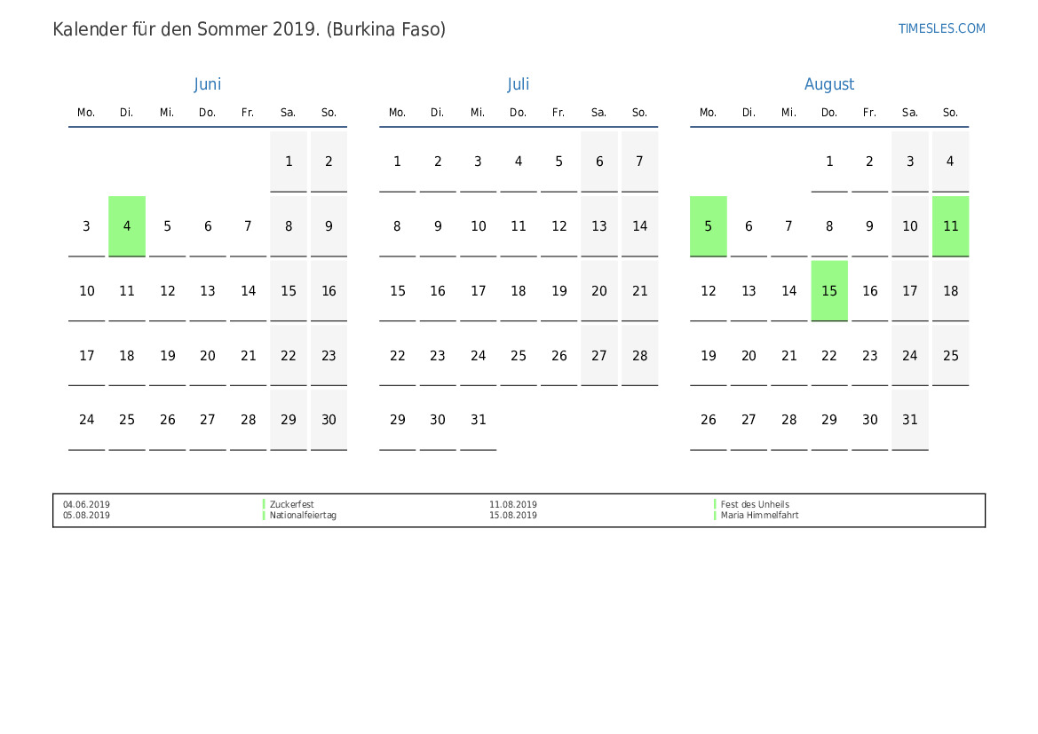 Laden Sie den PDF-Kalender mit Feiertagen und Wochenenden für den Sommer 2019 für Burkina Faso herunter und drucken Sie ihn aus