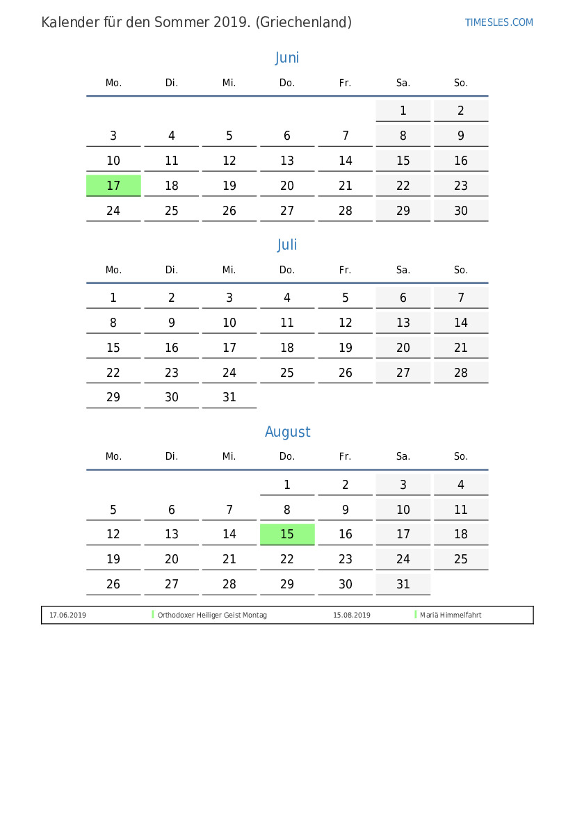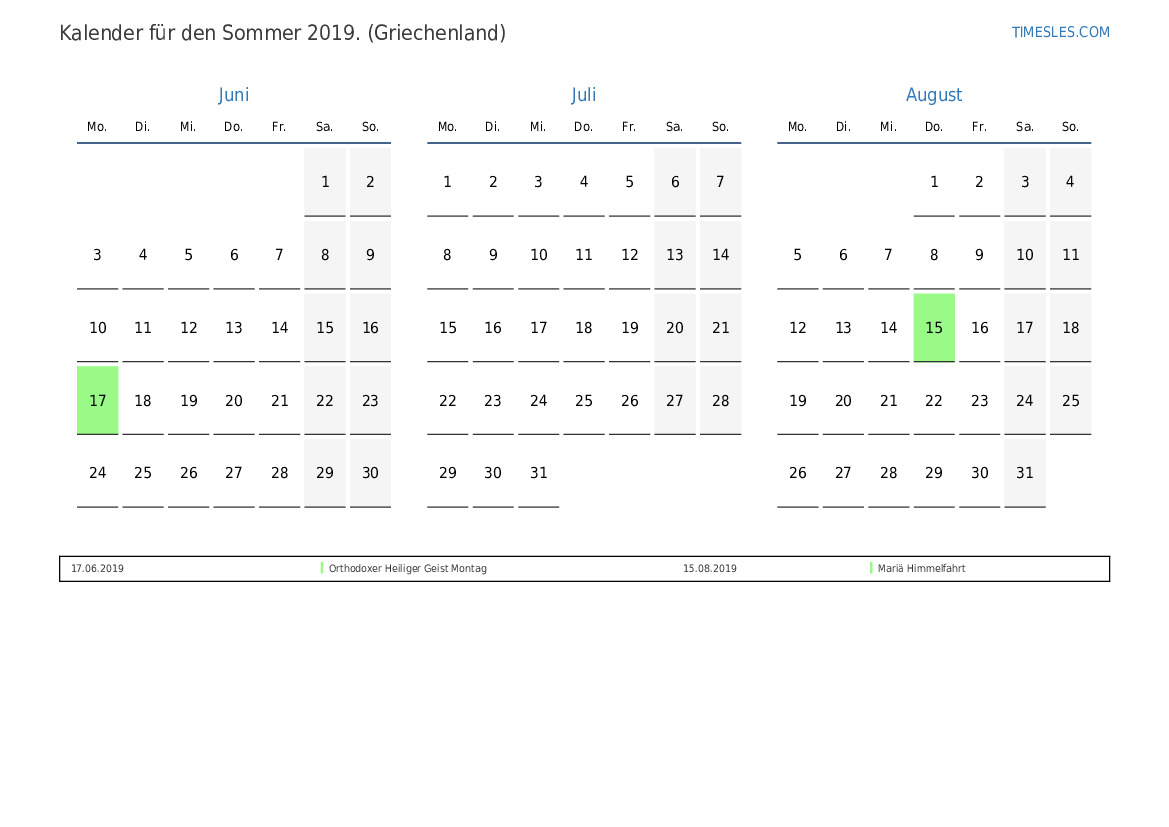 Laden Sie den PDF-Kalender mit Feiertagen und Wochenenden für den Sommer 2019 für Griechenland herunter und drucken Sie ihn aus