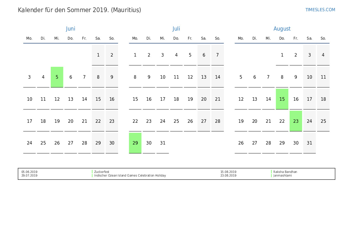Laden Sie den PDF-Kalender mit Feiertagen und Wochenenden für den Sommer 2019 für Mauritius herunter und drucken Sie ihn aus