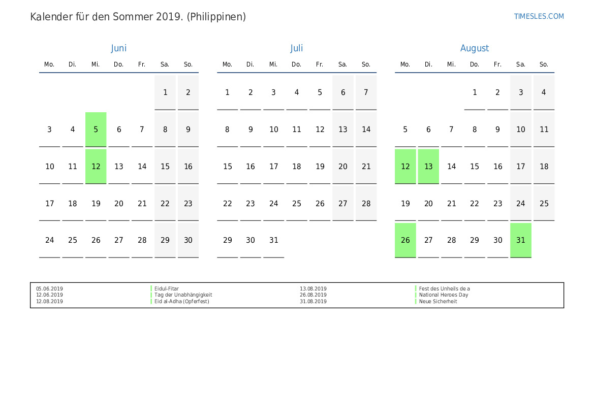 Laden Sie den PDF-Kalender mit Feiertagen und Wochenenden für den Sommer 2019 für die Philippinen herunter und drucken Sie ihn aus