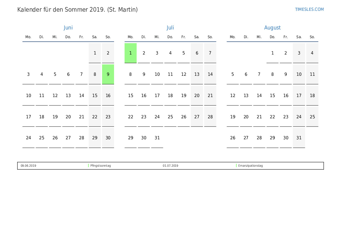 Kalender für den Sommer 2019 für Sint Maarten