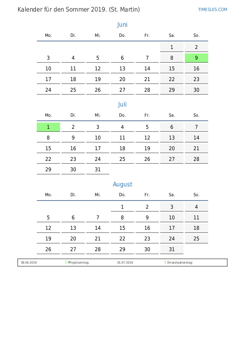 Laden Sie den PDF-Kalender mit Feiertagen und Wochenenden für den Sommer 2019 für Sint Maarten herunter und drucken Sie ihn aus