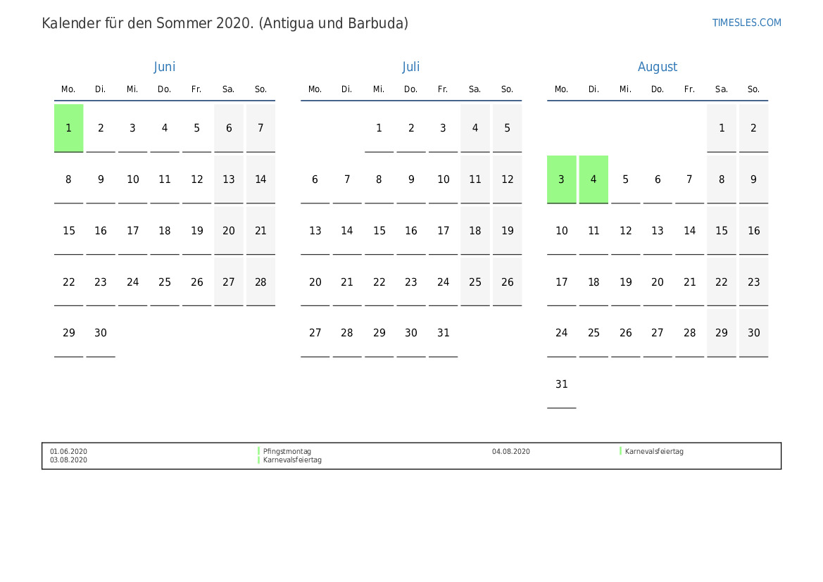 Kalender für den Sommer 2020 für Antigua und Barbuda