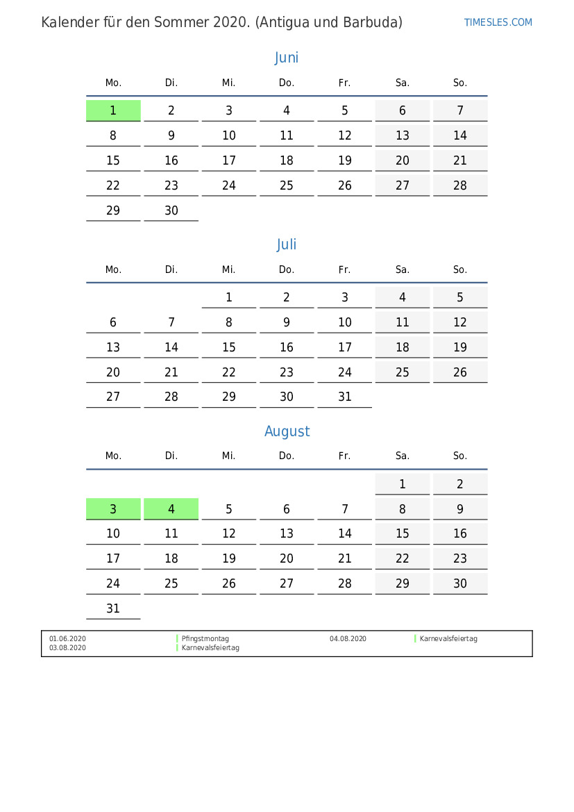 Laden Sie den PDF-Kalender mit Feiertagen und Wochenenden für den Sommer 2020 für Antigua und Barbuda herunter und drucken Sie ihn aus