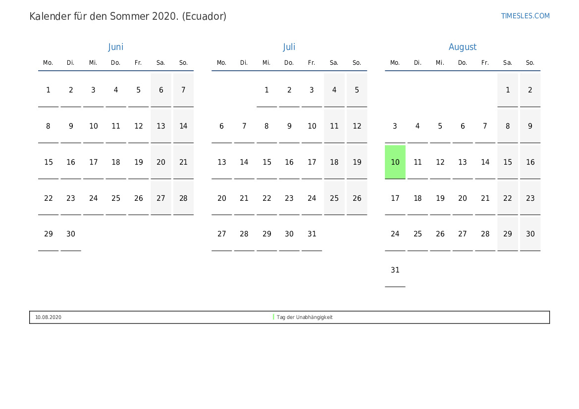 Laden Sie den PDF-Kalender mit Feiertagen und Wochenenden für den Sommer 2020 für Ecuador herunter und drucken Sie ihn aus