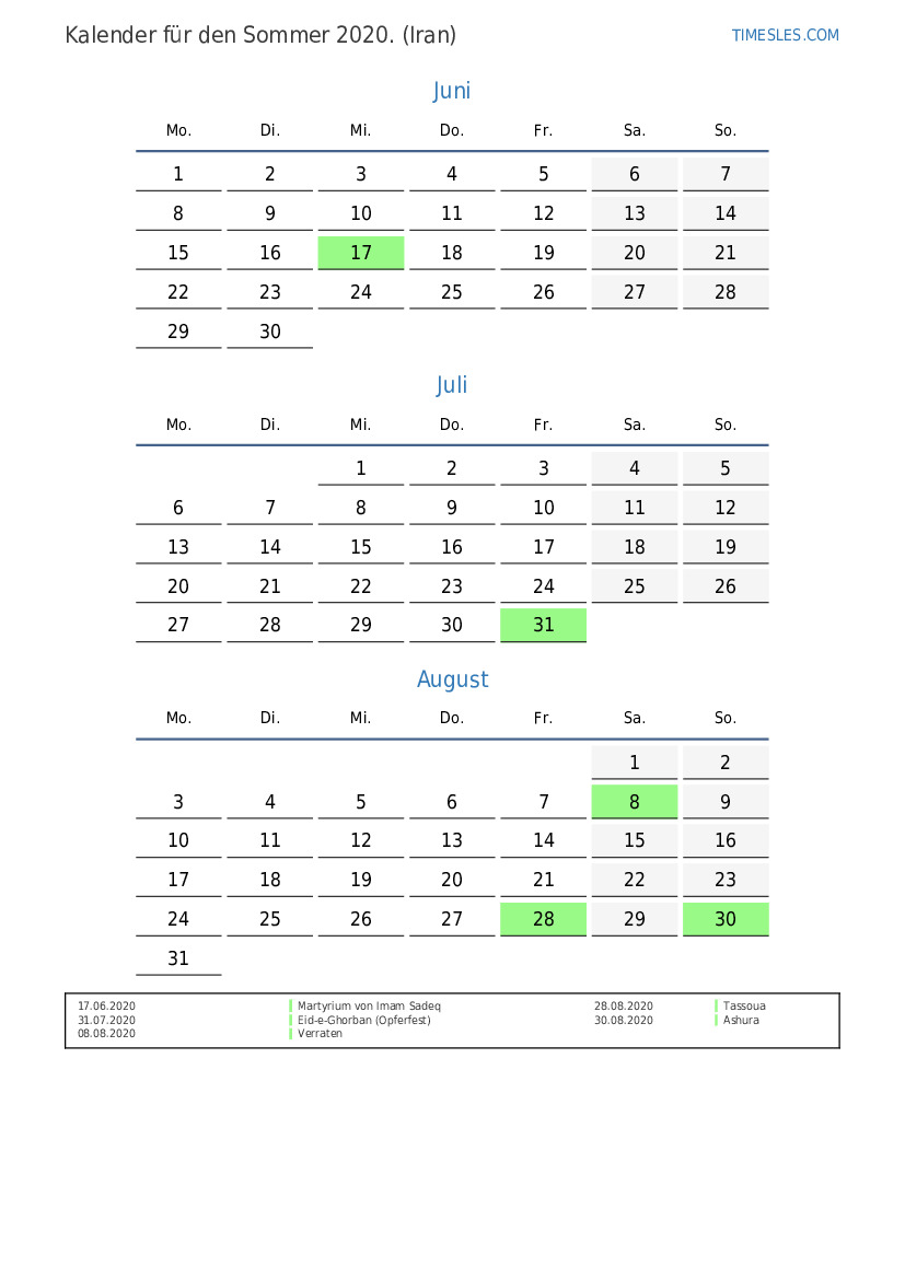 Laden Sie den PDF-Kalender mit Feiertagen und Wochenenden für den Sommer 2020 für den Iran herunter und drucken Sie ihn aus