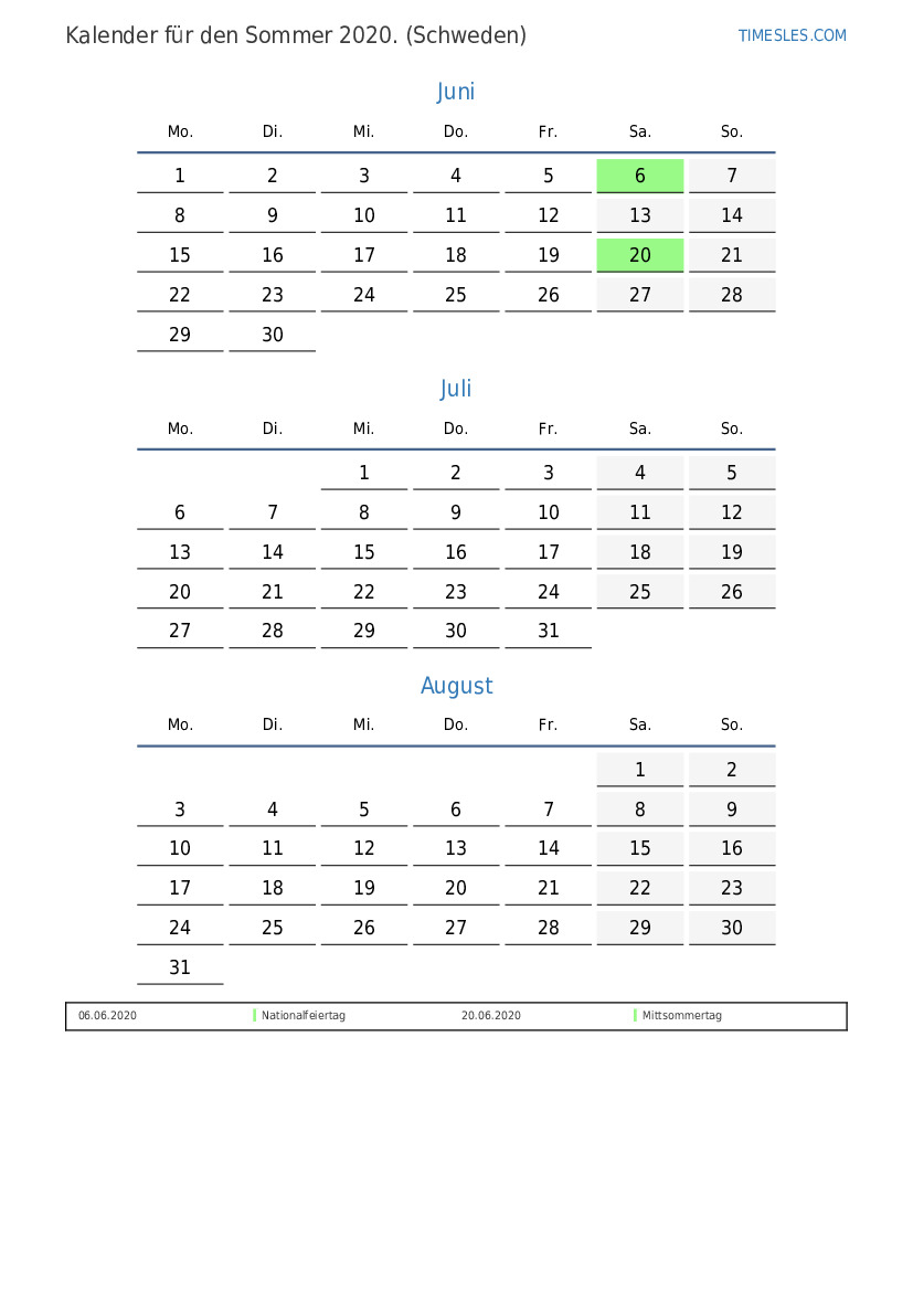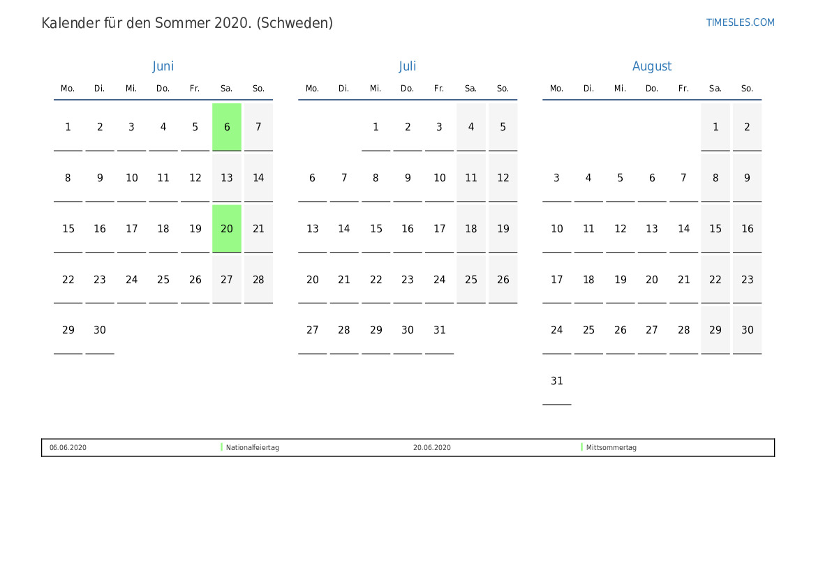 Laden Sie den PDF-Kalender mit Feiertagen und Wochenenden für den Sommer 2020 für Schweden herunter und drucken Sie ihn aus