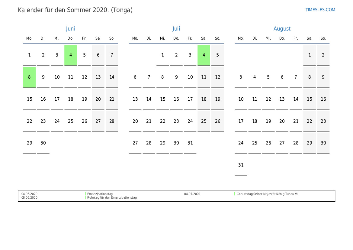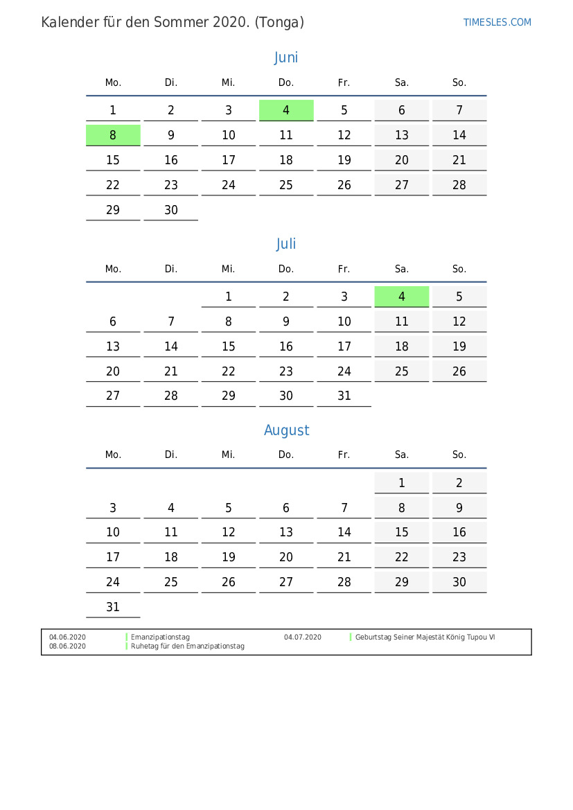 Laden Sie den PDF-Kalender mit Feiertagen und Wochenenden für den Sommer 2020 für Tonga herunter und drucken Sie ihn aus