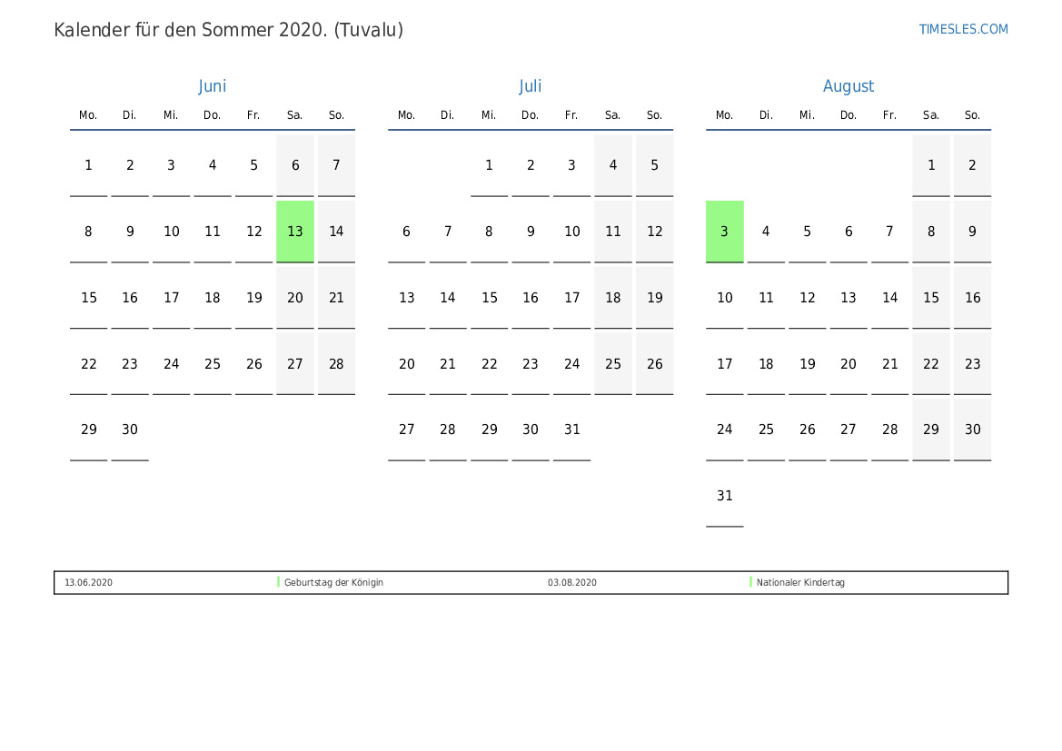 Laden Sie den PDF-Kalender mit Feiertagen und Wochenenden für den Sommer 2020 für Tuvalu herunter und drucken Sie ihn aus