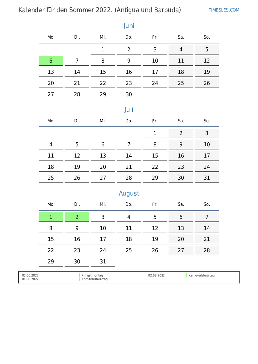 Kalender für den Sommer 2022 für Antigua und Barbuda