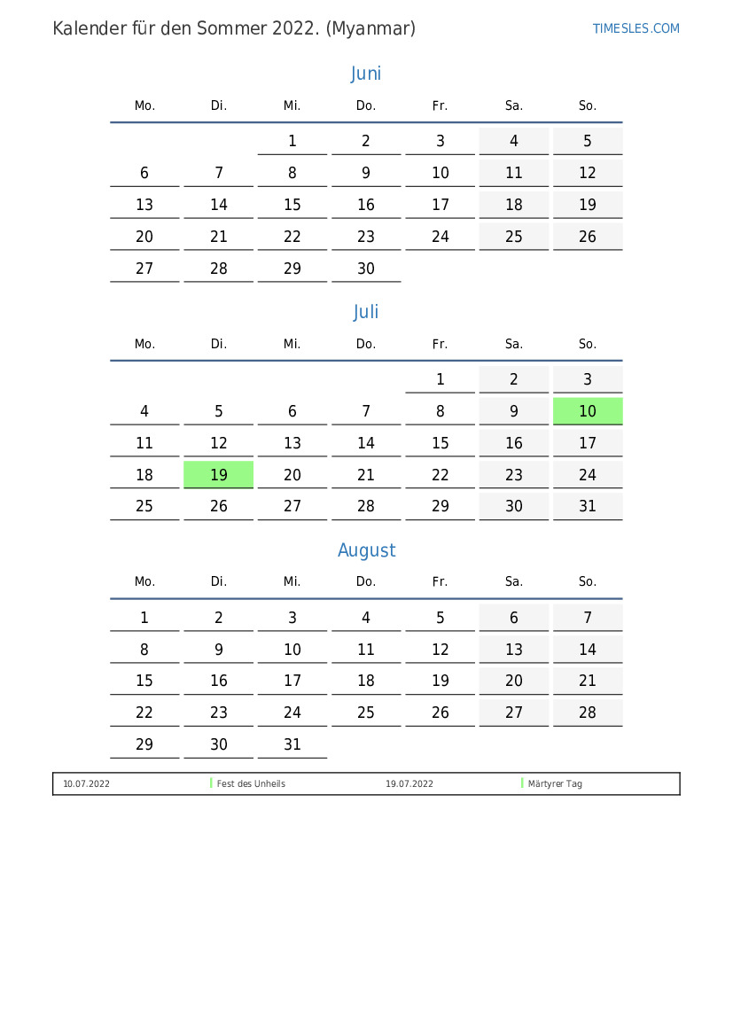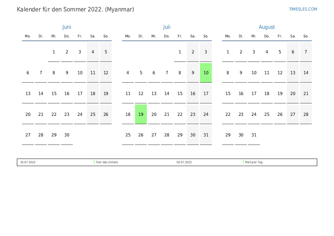 Laden Sie den PDF-Kalender mit Feiertagen und Wochenenden für den Sommer 2022 für Myanmar herunter und drucken Sie ihn aus