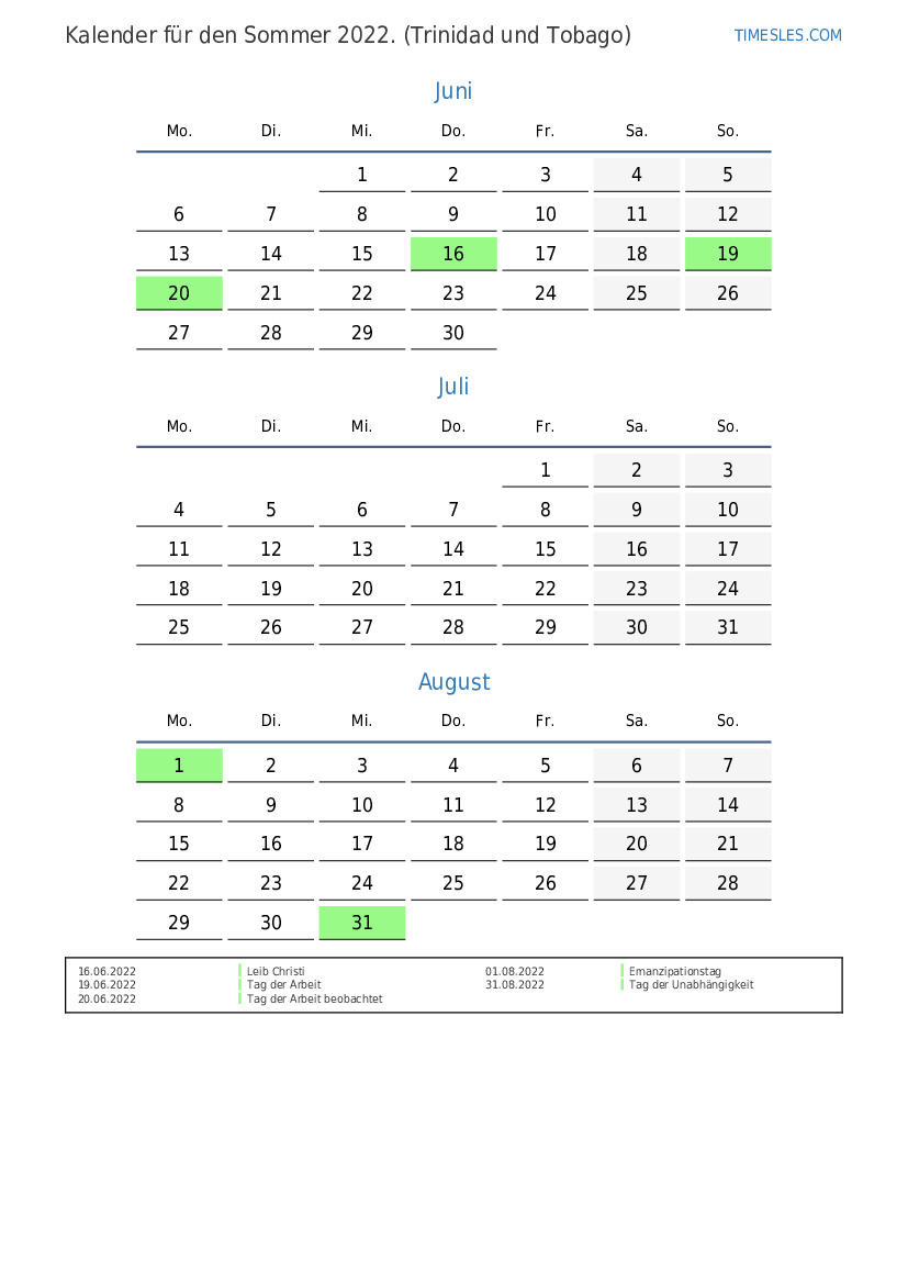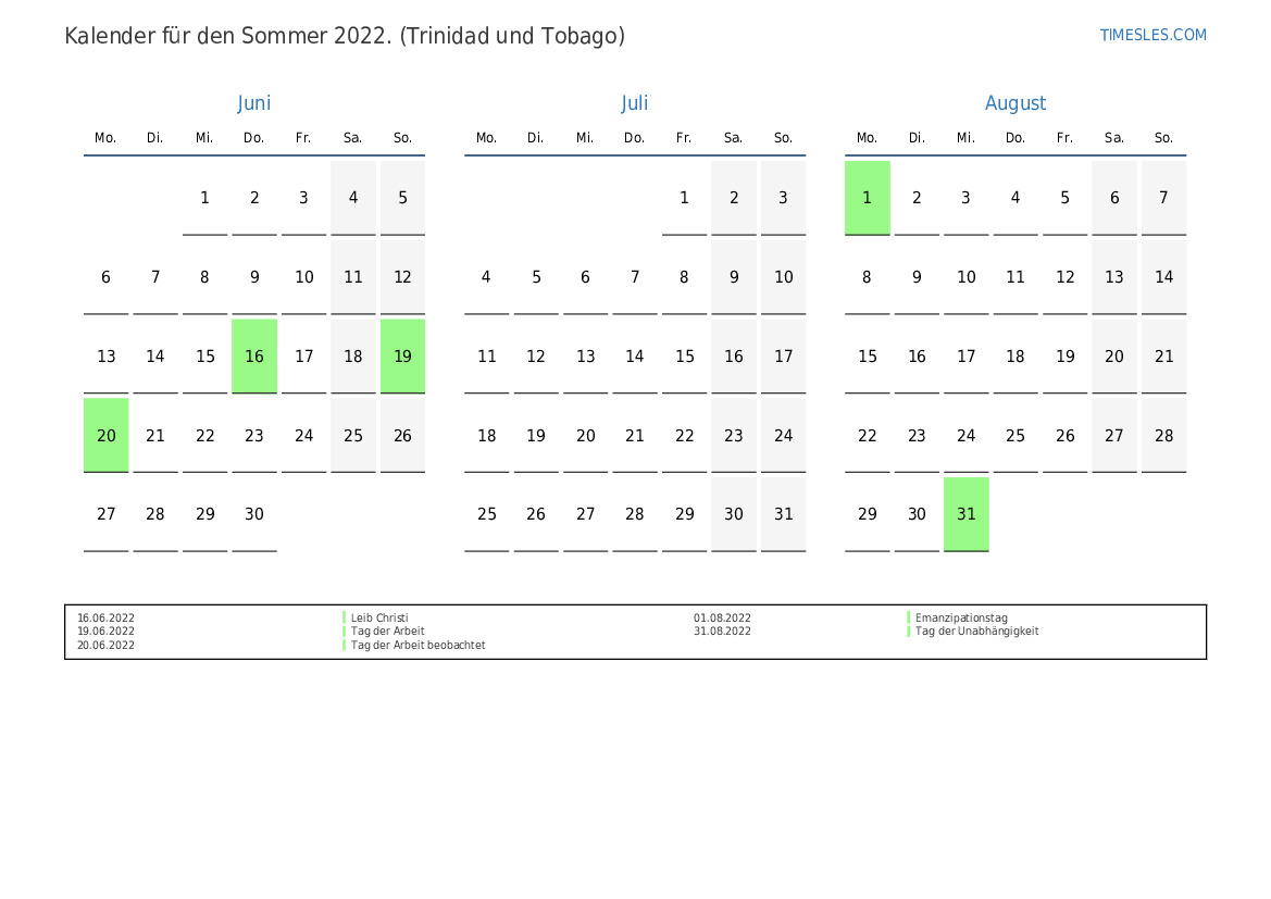 Laden Sie den PDF-Kalender mit Feiertagen und Wochenenden für den Sommer 2022 für Trinidad und Tobago herunter und drucken Sie ihn aus