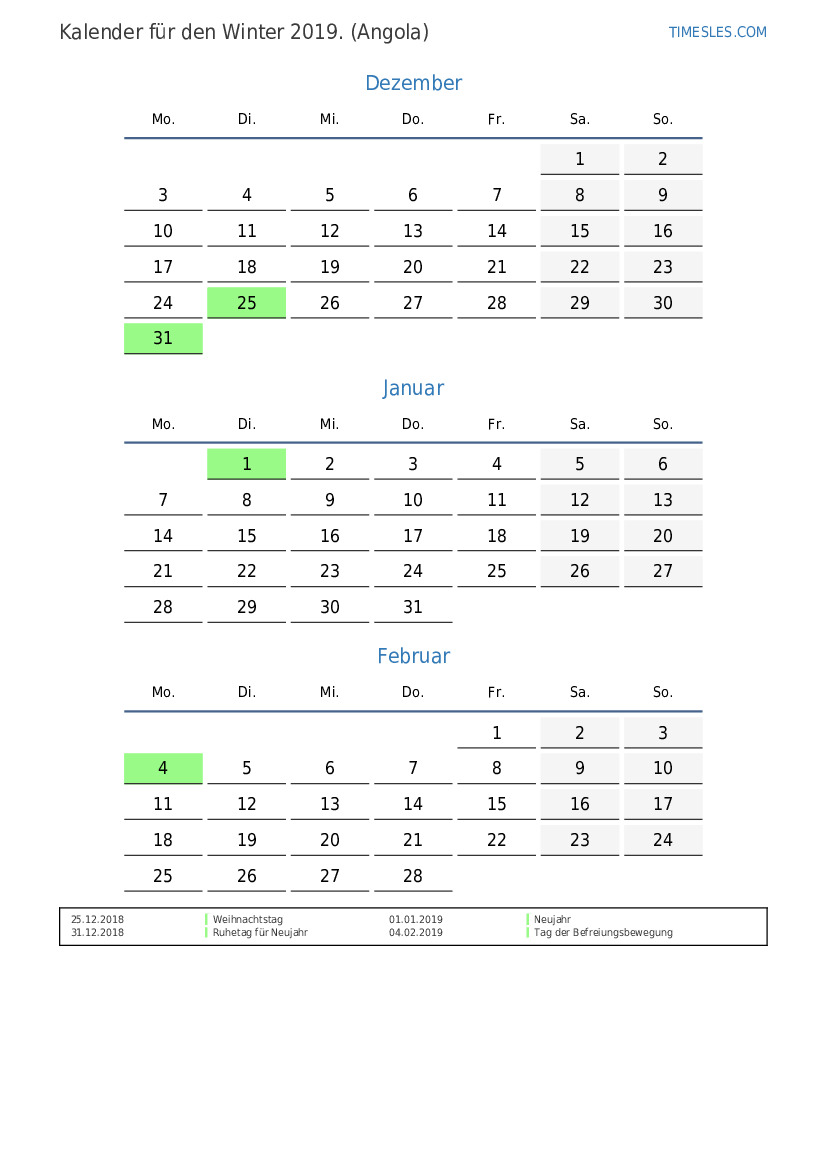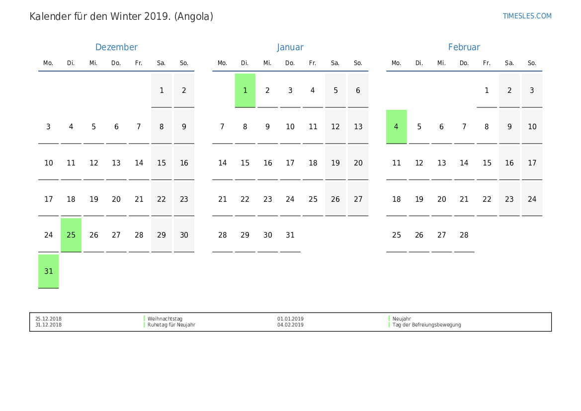 Laden Sie den PDF-Kalender mit Feiertagen und Wochenenden für den Winter 2019 für Angola herunter und drucken Sie ihn aus
