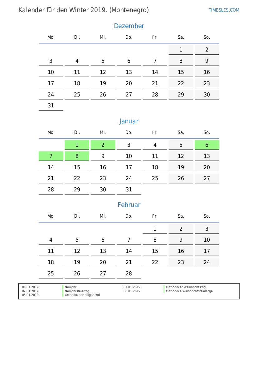 Laden Sie den PDF-Kalender mit Feiertagen und Wochenenden für den Winter 2019 für Montenegro herunter und drucken Sie ihn aus