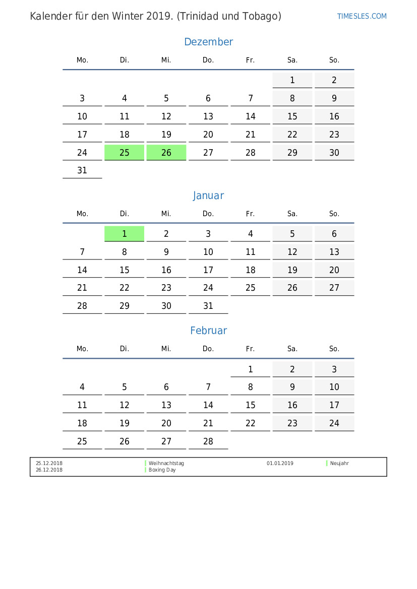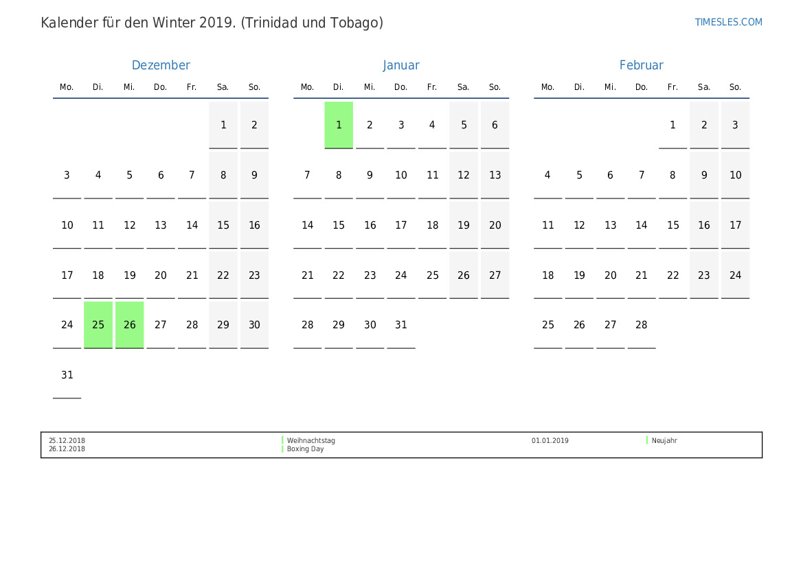 Laden Sie den PDF-Kalender mit Feiertagen und Wochenenden für den Winter 2019 für Trinidad und Tobago herunter und drucken Sie ihn aus