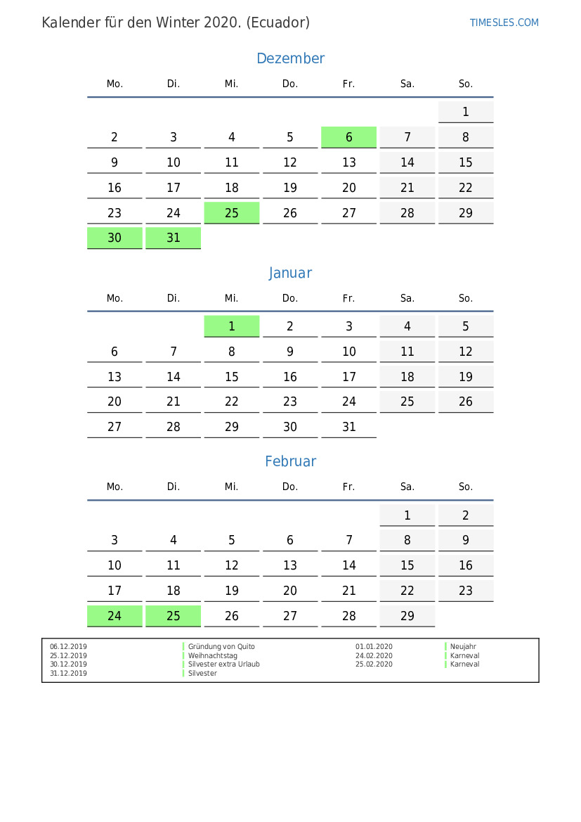 Laden Sie den PDF-Kalender mit Feiertagen und Wochenenden für den Winter 2020 für Ecuador herunter und drucken Sie ihn aus