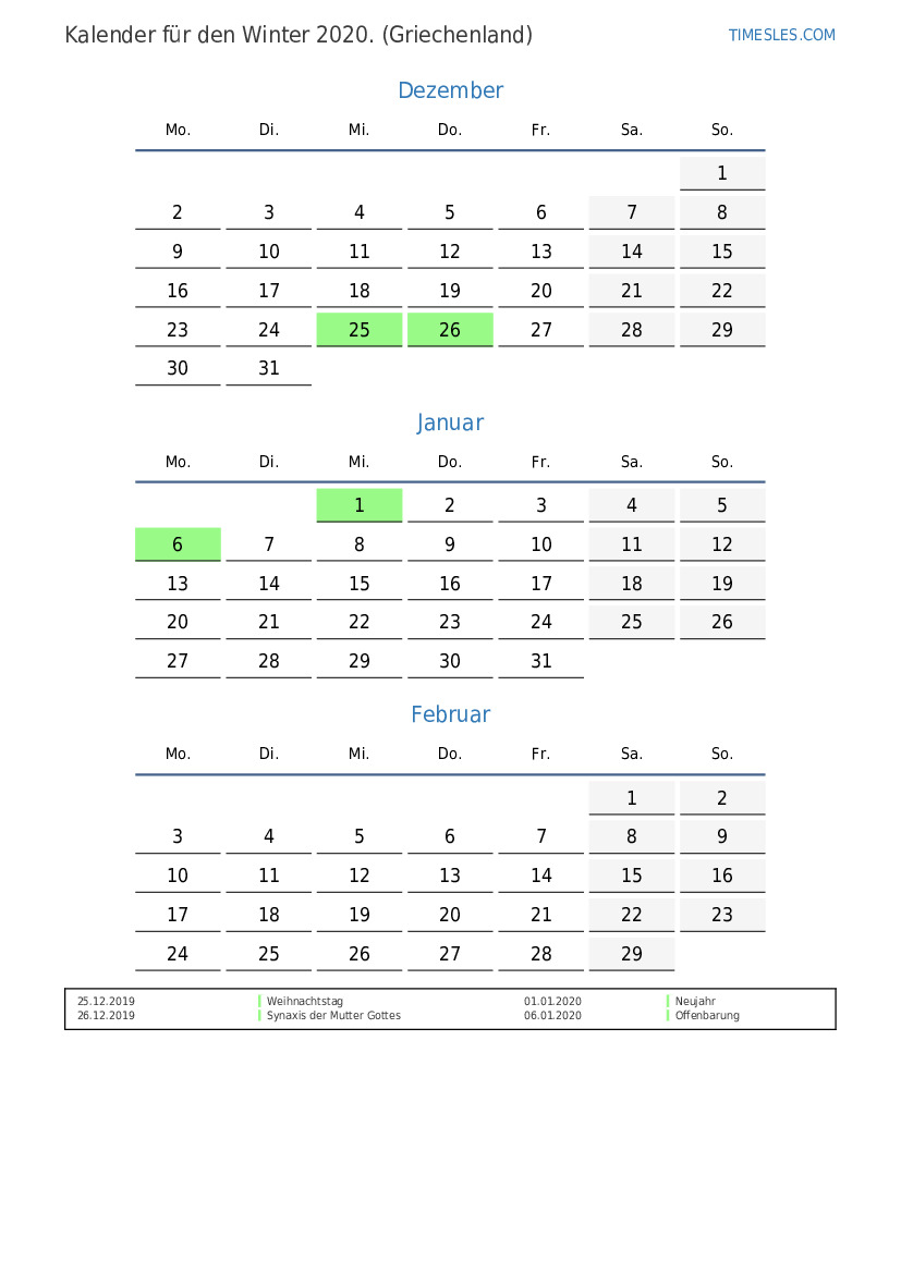 Kalender für den Winter 2020 für Griechenland