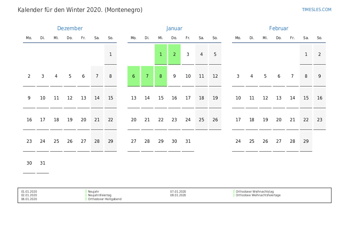 Laden Sie den PDF-Kalender mit Feiertagen und Wochenenden für den Winter 2020 für Montenegro herunter und drucken Sie ihn aus