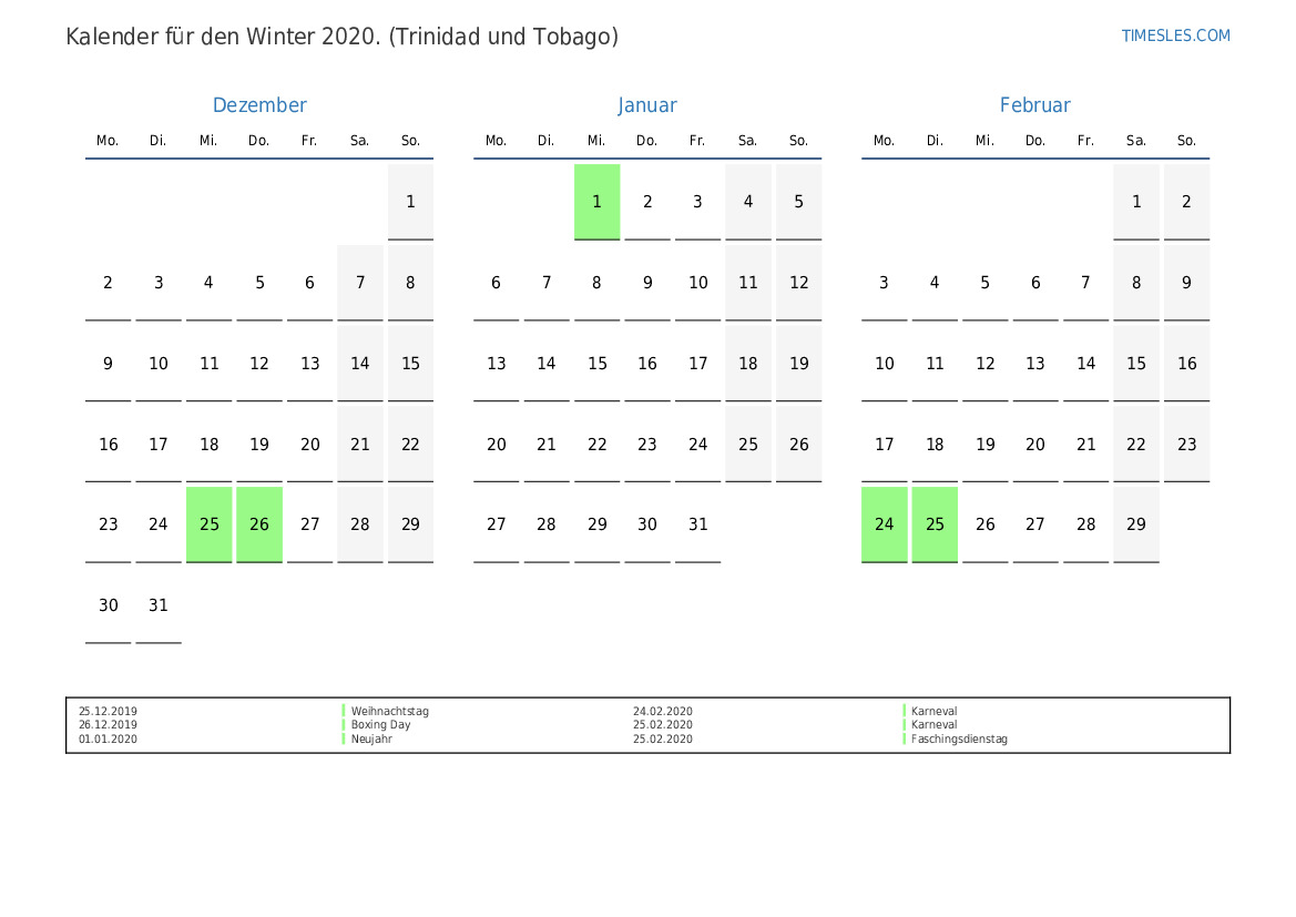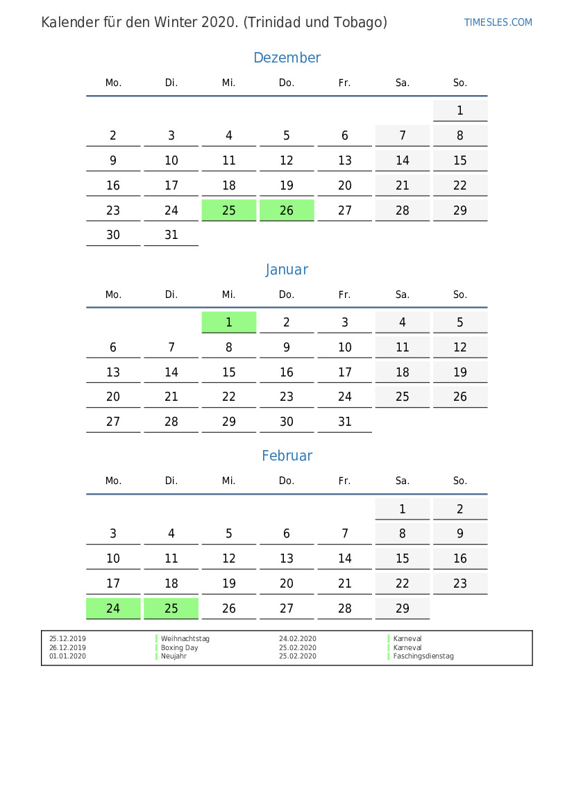 Laden Sie den PDF-Kalender mit Feiertagen und Wochenenden für den Winter 2020 für Trinidad und Tobago herunter und drucken Sie ihn aus