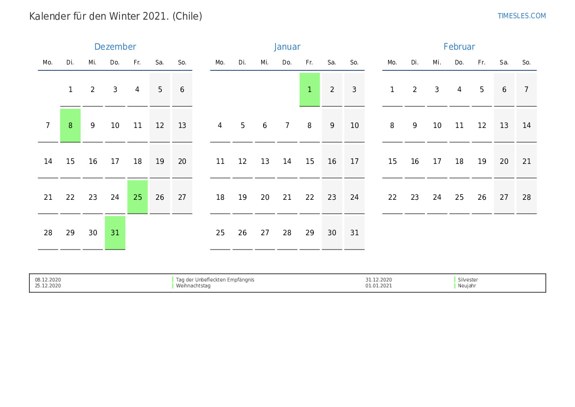 Kalender der Feiertage und Wochenenden für den Winter 2021 für Chile