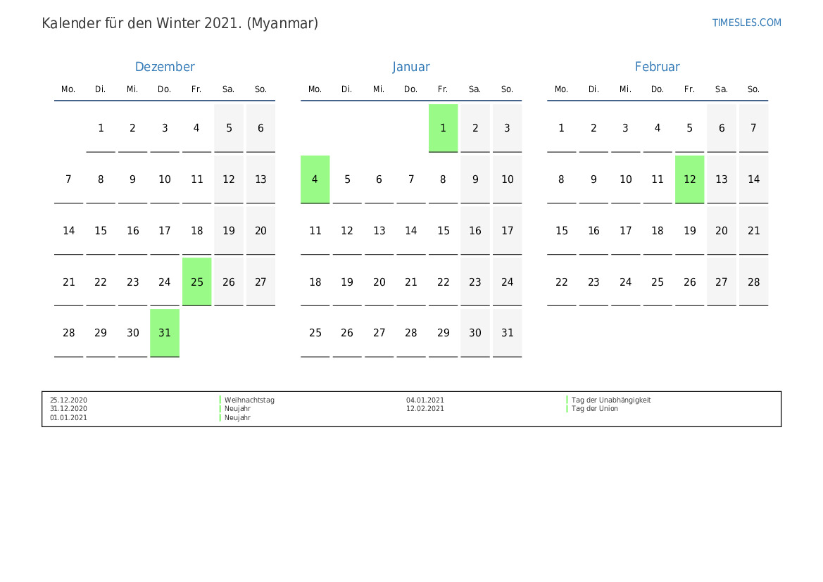Laden Sie den PDF-Kalender mit Feiertagen und Wochenenden für den Winter 2021 für Myanmar herunter und drucken Sie ihn aus