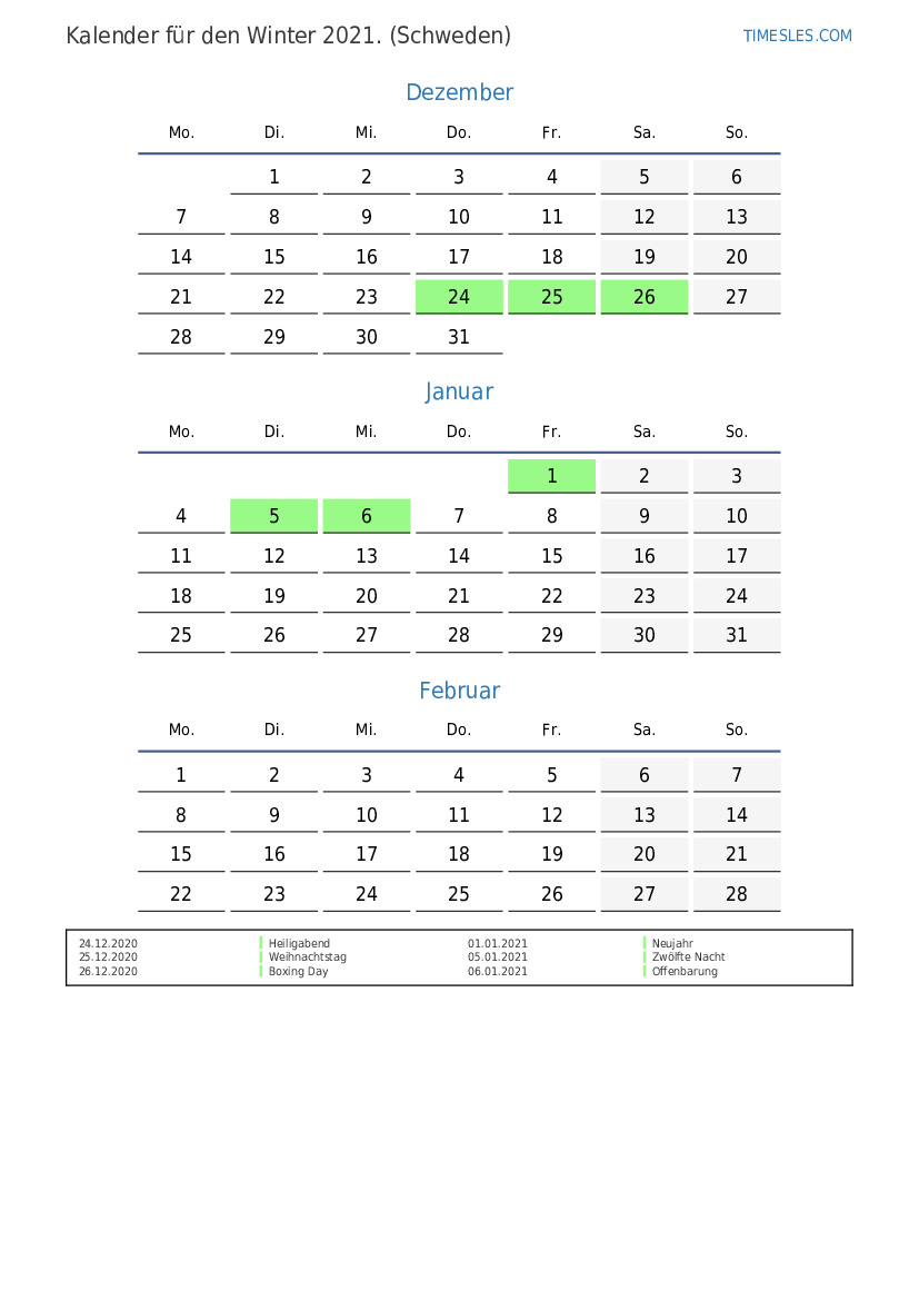 Laden Sie den PDF-Kalender mit Feiertagen und Wochenenden für den Winter 2021 für Schweden herunter und drucken Sie ihn aus