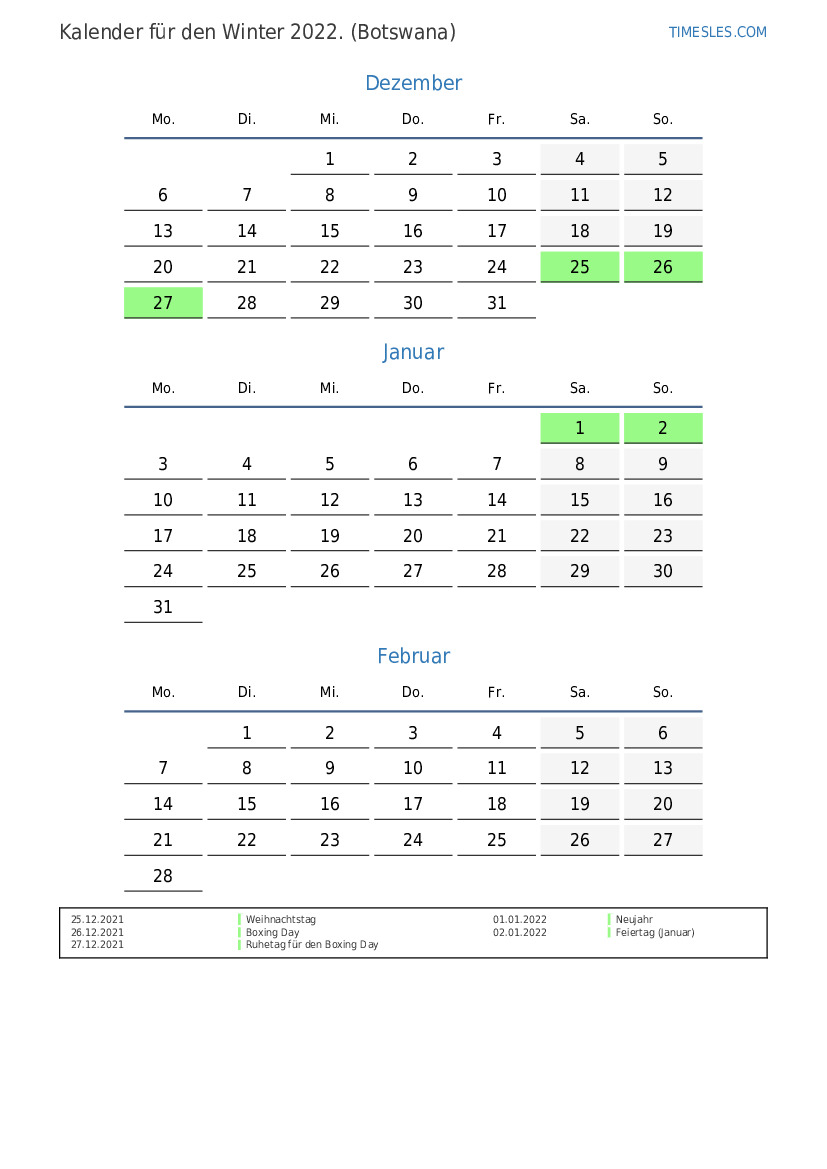 Laden Sie den PDF-Kalender mit Feiertagen und Wochenenden für den Winter 2022 für Botswana herunter und drucken Sie ihn aus