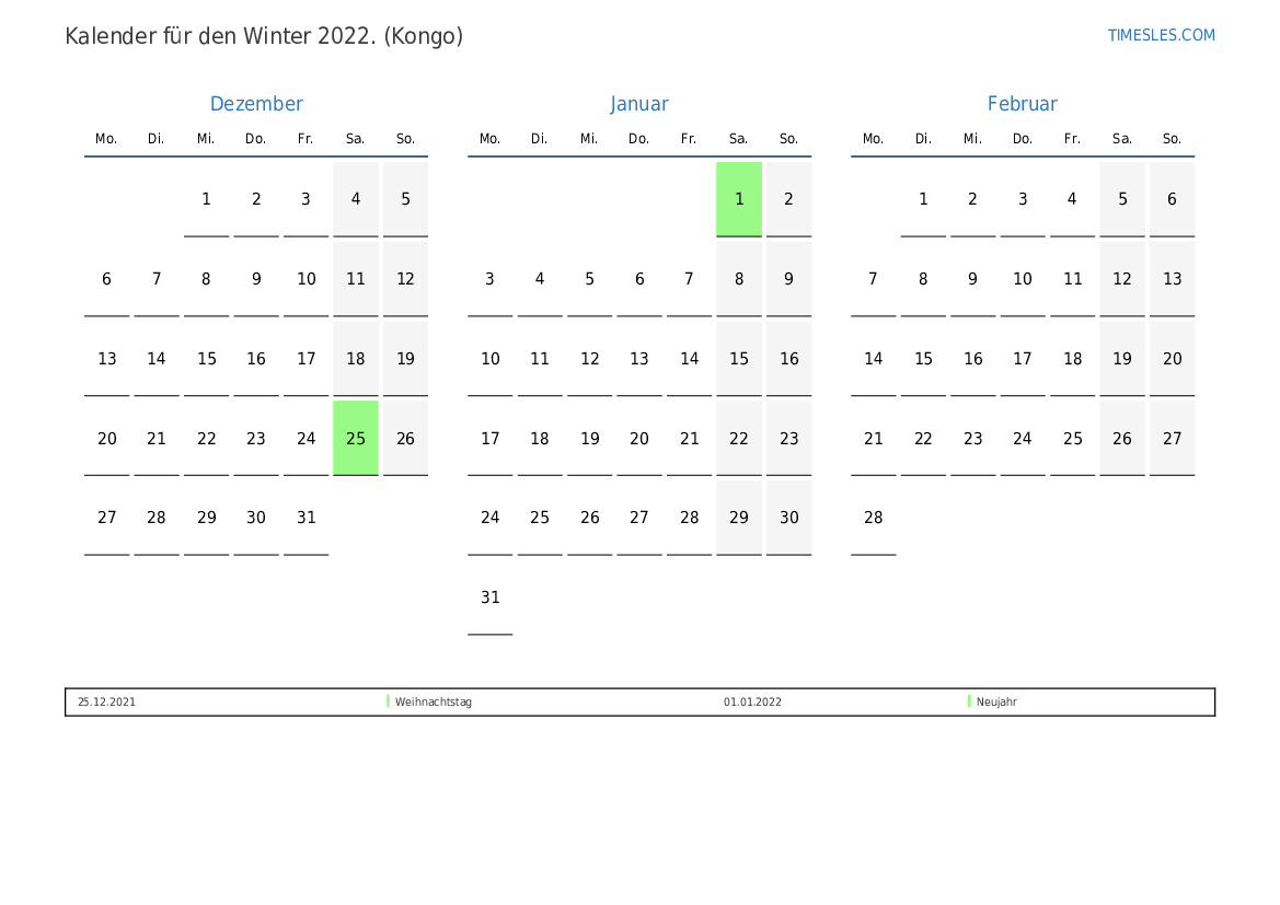 Laden Sie den PDF-Kalender mit Feiertagen und Wochenenden für den Winter 2022 für den Kongo herunter und drucken Sie ihn aus