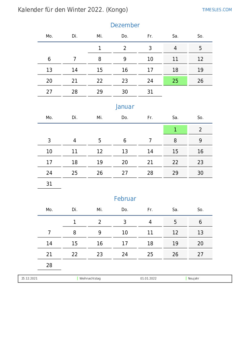 Kalender der Feiertage und Wochenenden für den Winter 2022 für den Kongo
