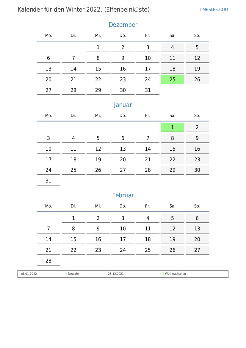 Laden Sie den PDF-Kalender mit Feiertagen und Wochenenden für den Winter 2022 für die Elfenbeinküste herunter und drucken Sie ihn aus