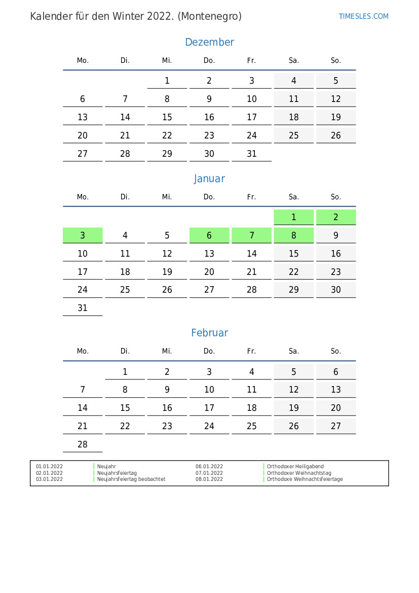 Laden Sie den PDF-Kalender mit Feiertagen und Wochenenden für den Winter 2022 für Montenegro herunter und drucken Sie ihn aus
