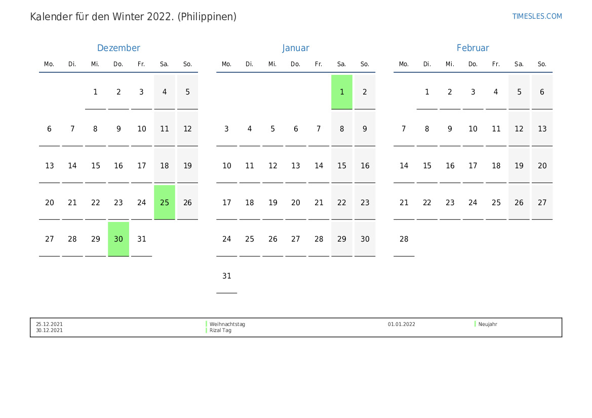 Laden Sie den PDF-Kalender mit Feiertagen und Wochenenden für den Winter 2022 für die Philippinen herunter und drucken Sie ihn aus